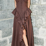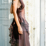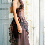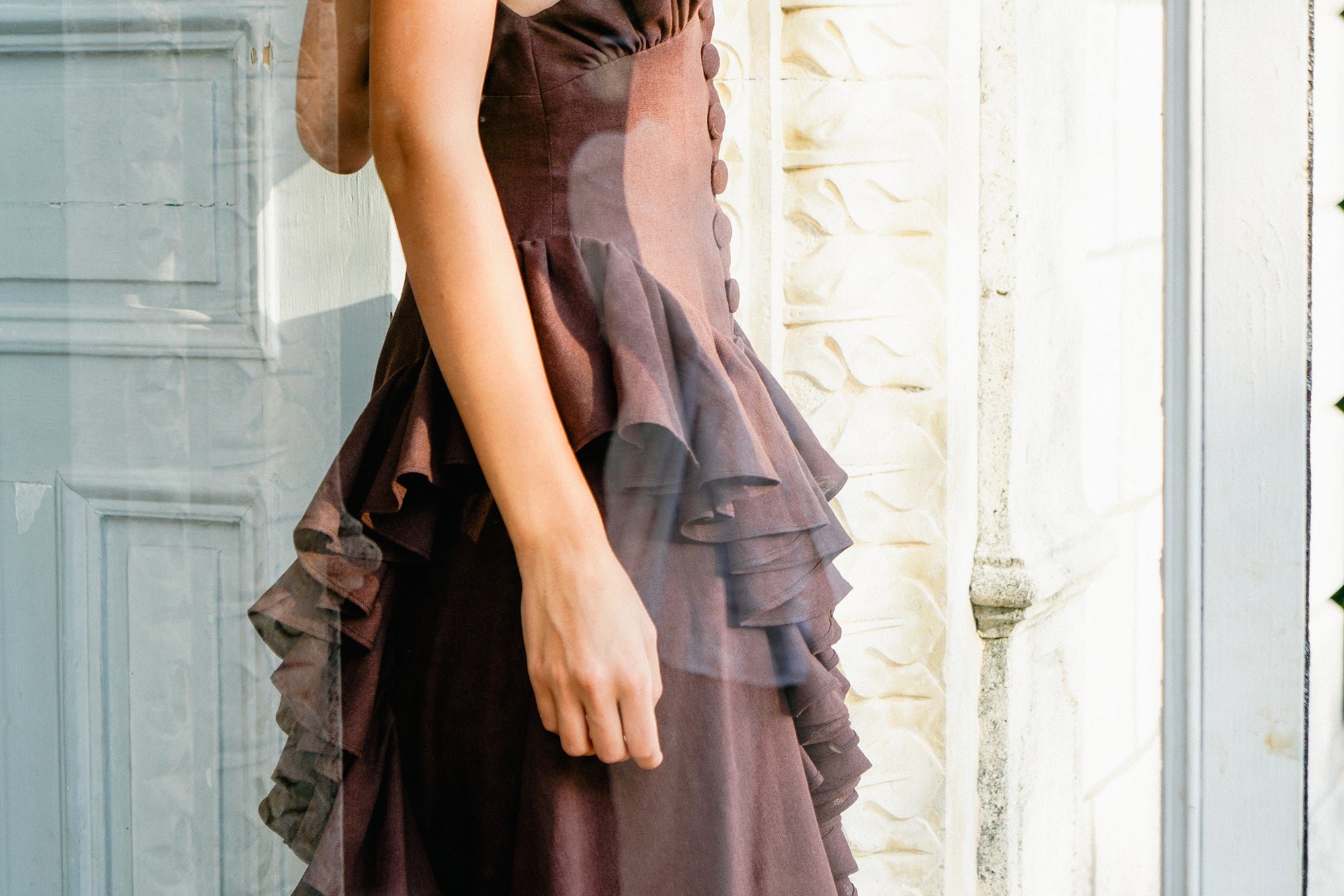 A refined and timeless piece that fit every occasion. Featuring a deep V neck on the front and back, the 'andalouse' dress is accentuated by buttons and gathered ruffles around the bodice. It creates the most flattering silhouette.