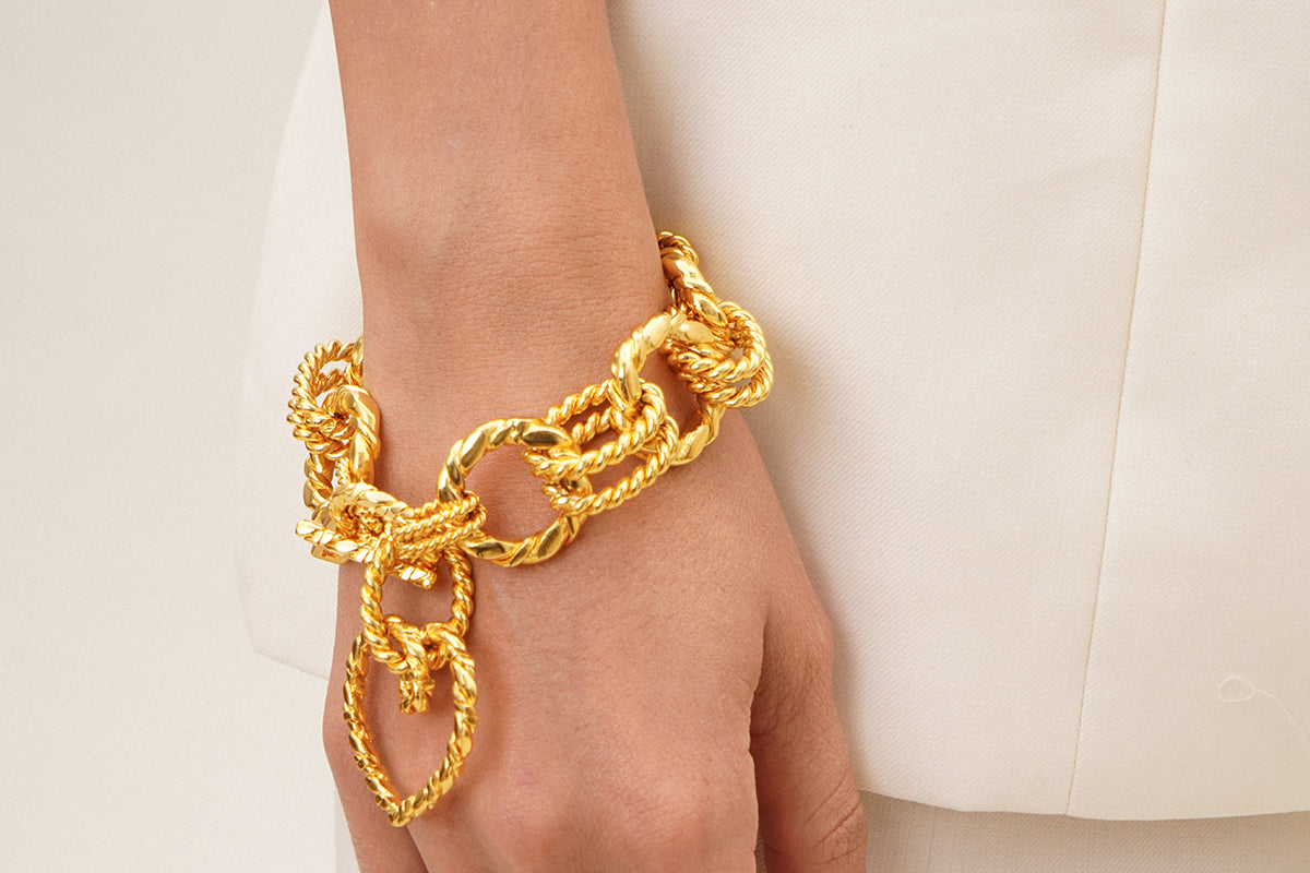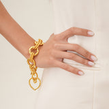 The Darling chain bracelet looks cool around the cuff of a long-sleeved gown or slouchy sweater. It's been made from 18 carats gold-plated brass and has chunky chain links . Adjust the T bar in the heart to find your perfect fit.
