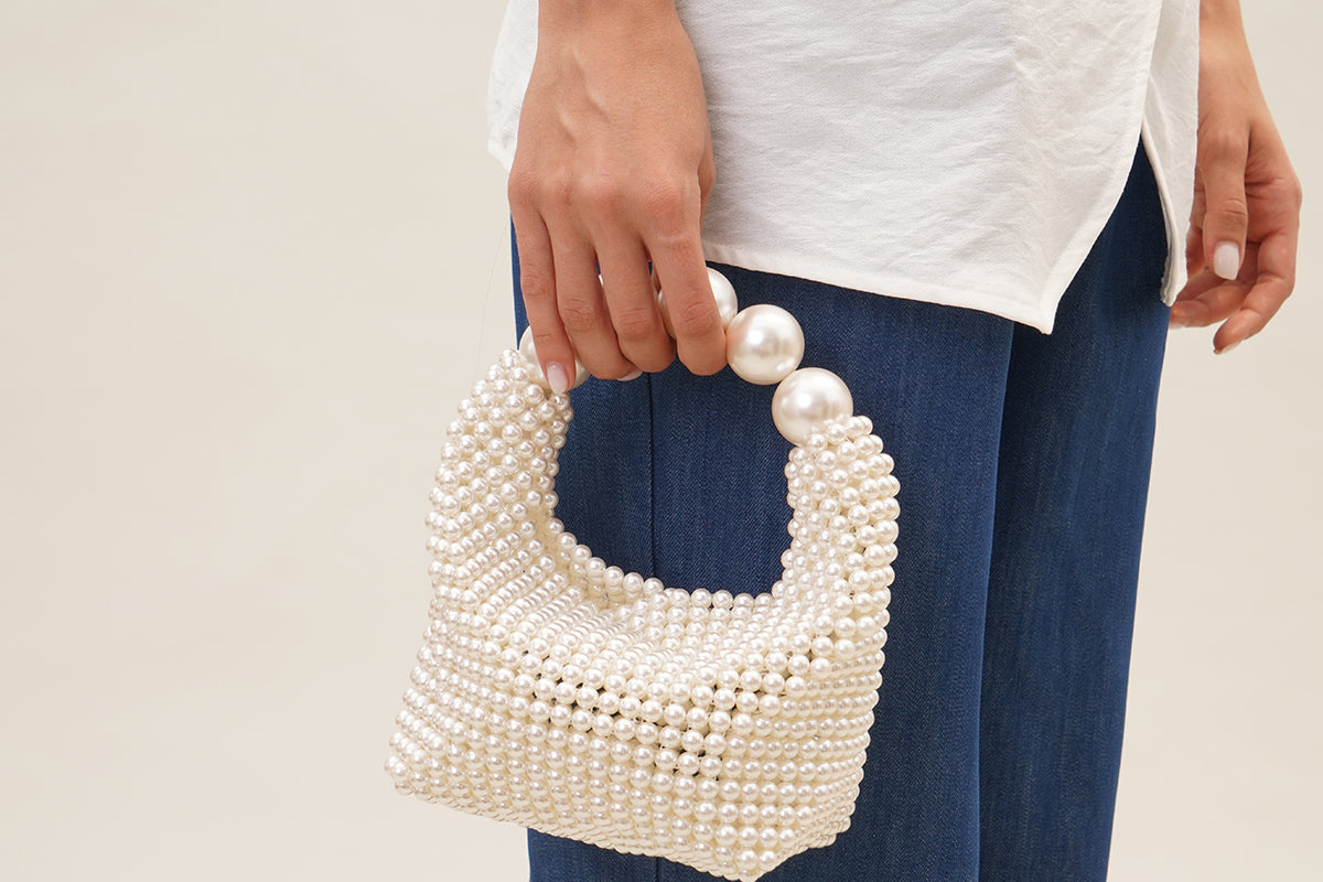 Inspired by our infamous 'Echappé' design, the 'Nuit Blanche' bag is intricately handmade with glossy pearls with a beaded handle and a fold-over flap closure. It's the perfect touch to your evening looks.