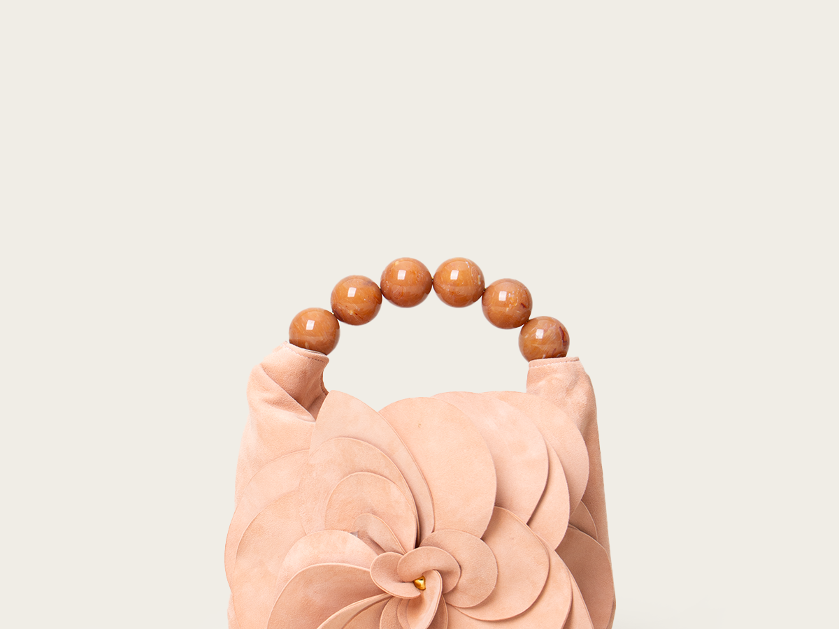 A unique handbag that adds dimension and novelty to your looks. It features handle adorned with textured foiled beads and an oversized handmade flower.