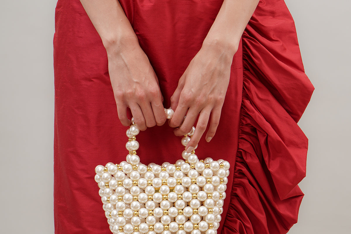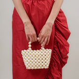 A statement piece with a structured shape fully handcrafted in glossy beads, with Vanina's signature technique. This retro-mordern beauty features 2 small handles that can be easily carried.