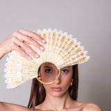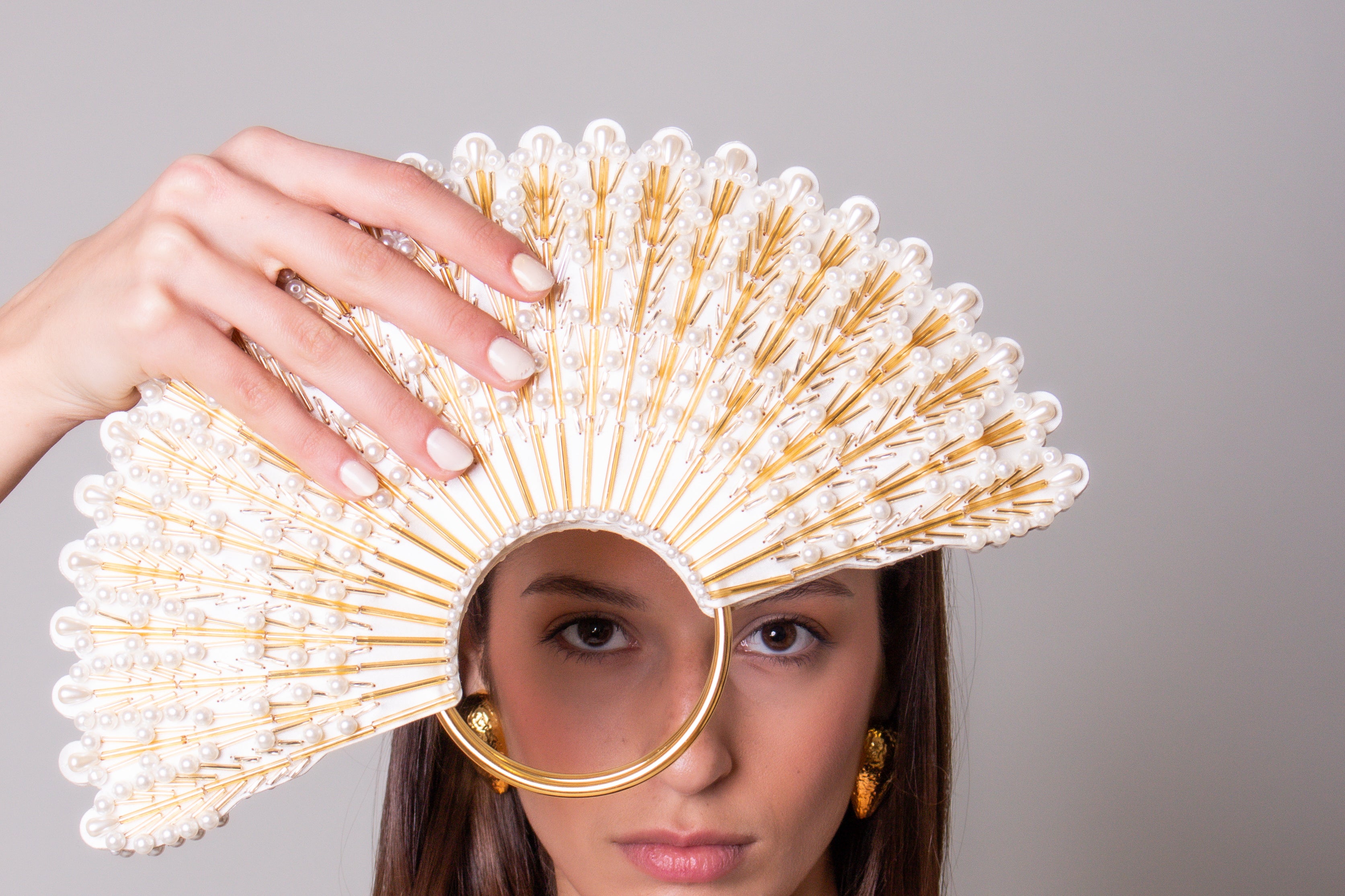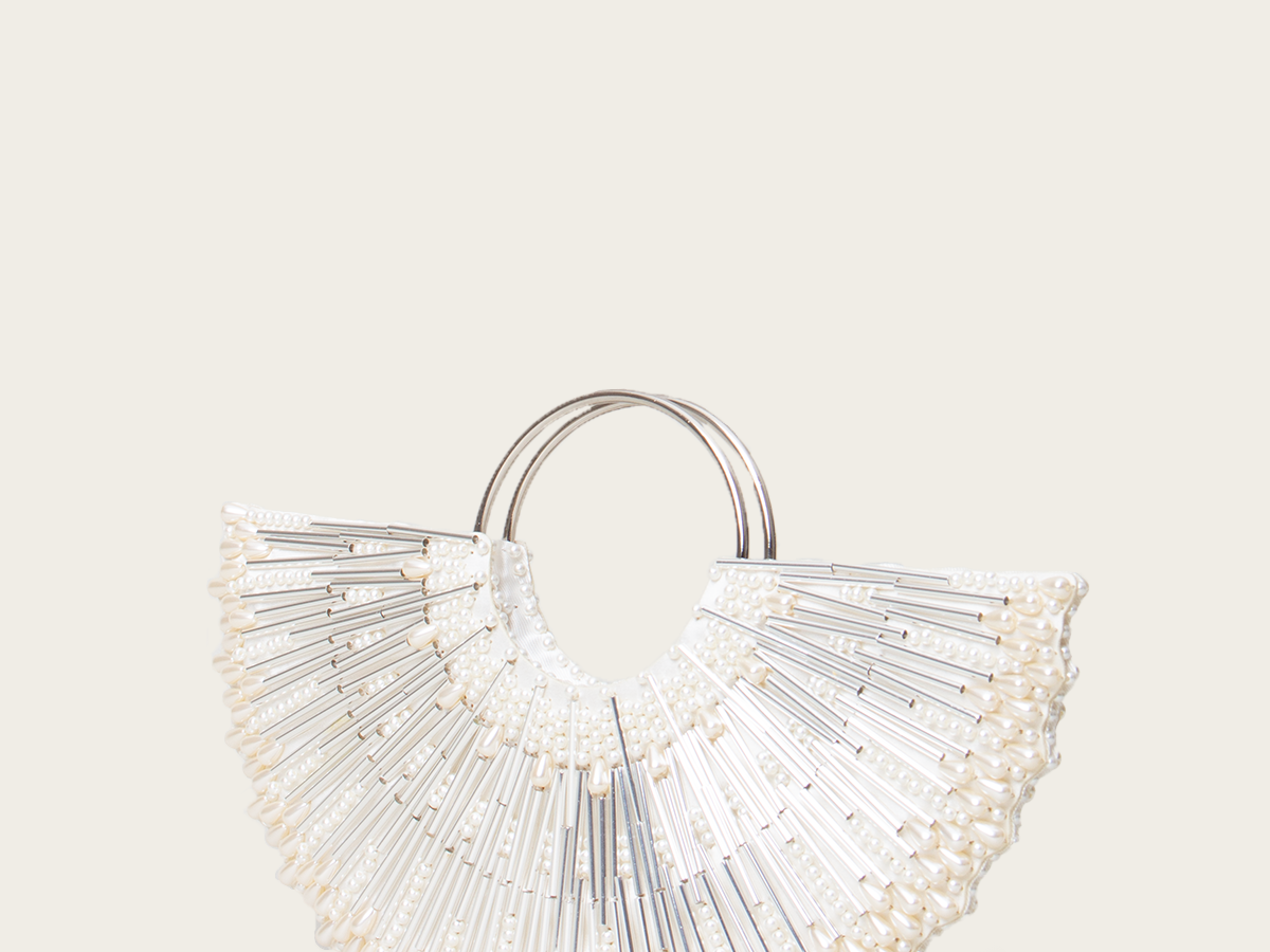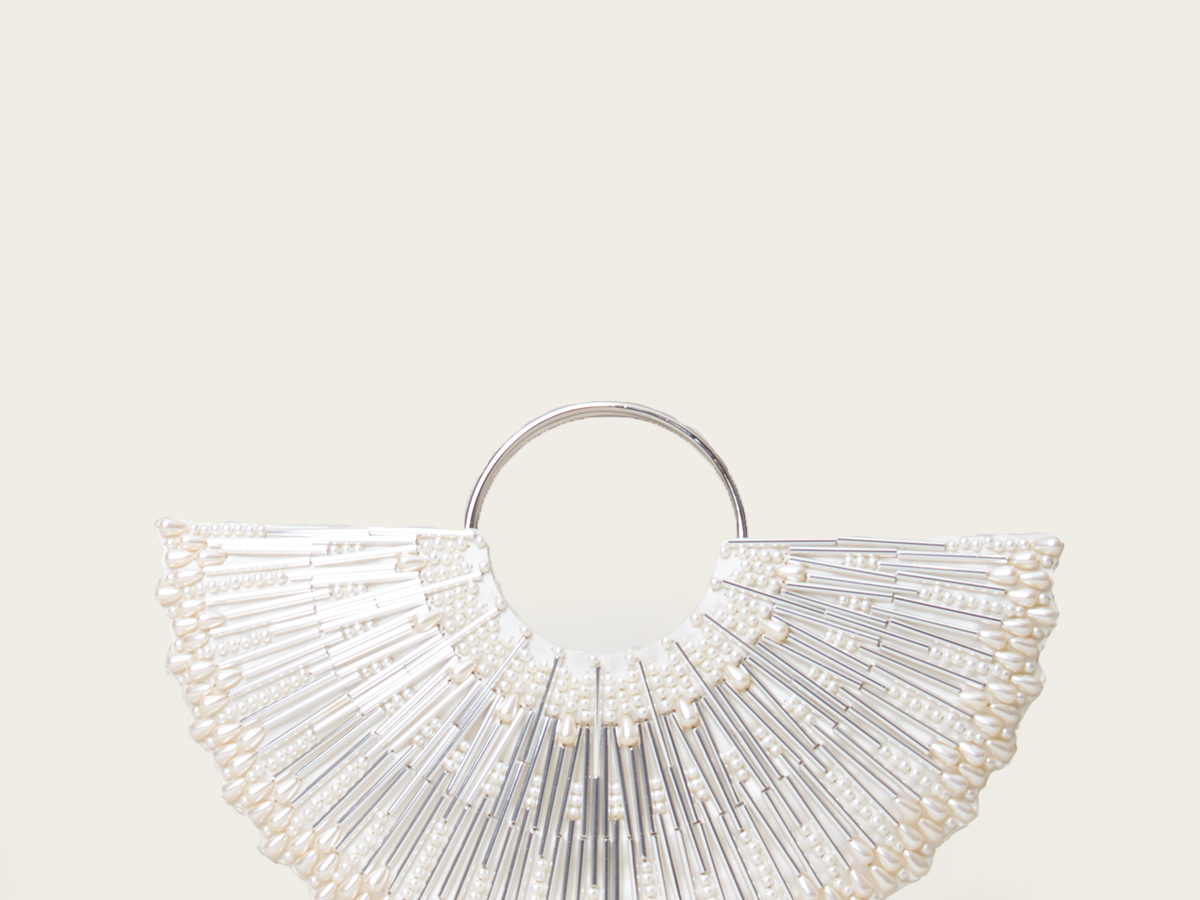 An arch-shaped handbag, crafted with delicate pearls of various shapes, with a sleek circular handle. Its intricate silver and gold beading creates a subtle, radiant sparkle, perfect for an elegant touch.