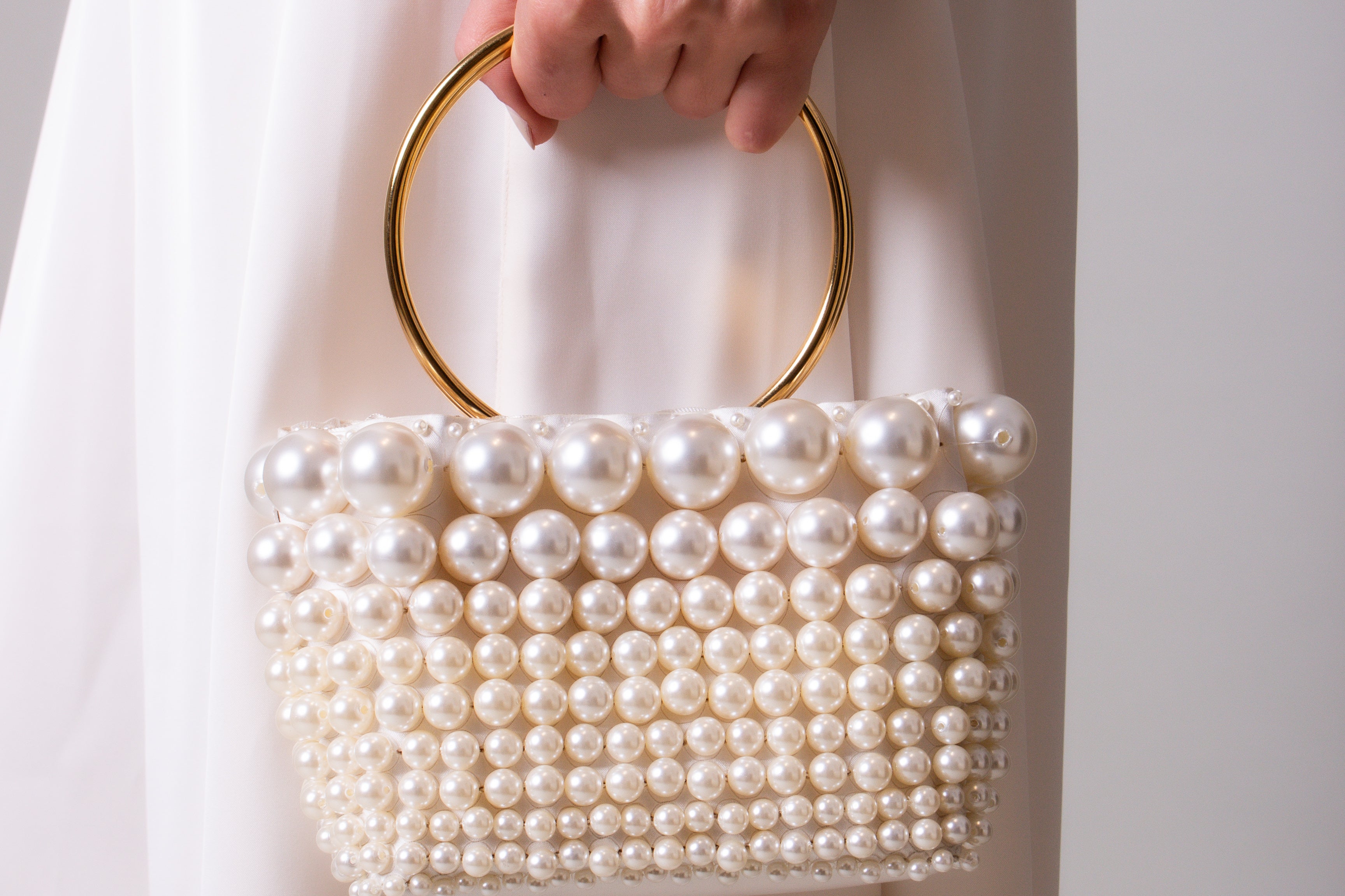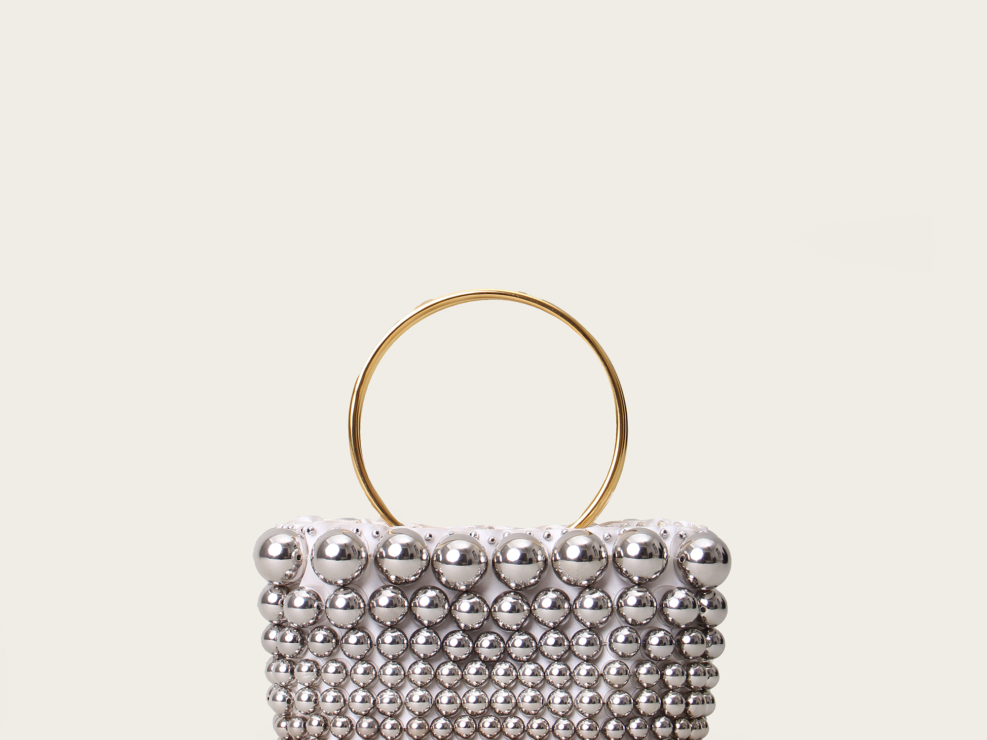 A basket-shaped design handcrafted with cascading glossy acrylic pearls. It features a gold-plated circular handle for a geometric and structured appearance.