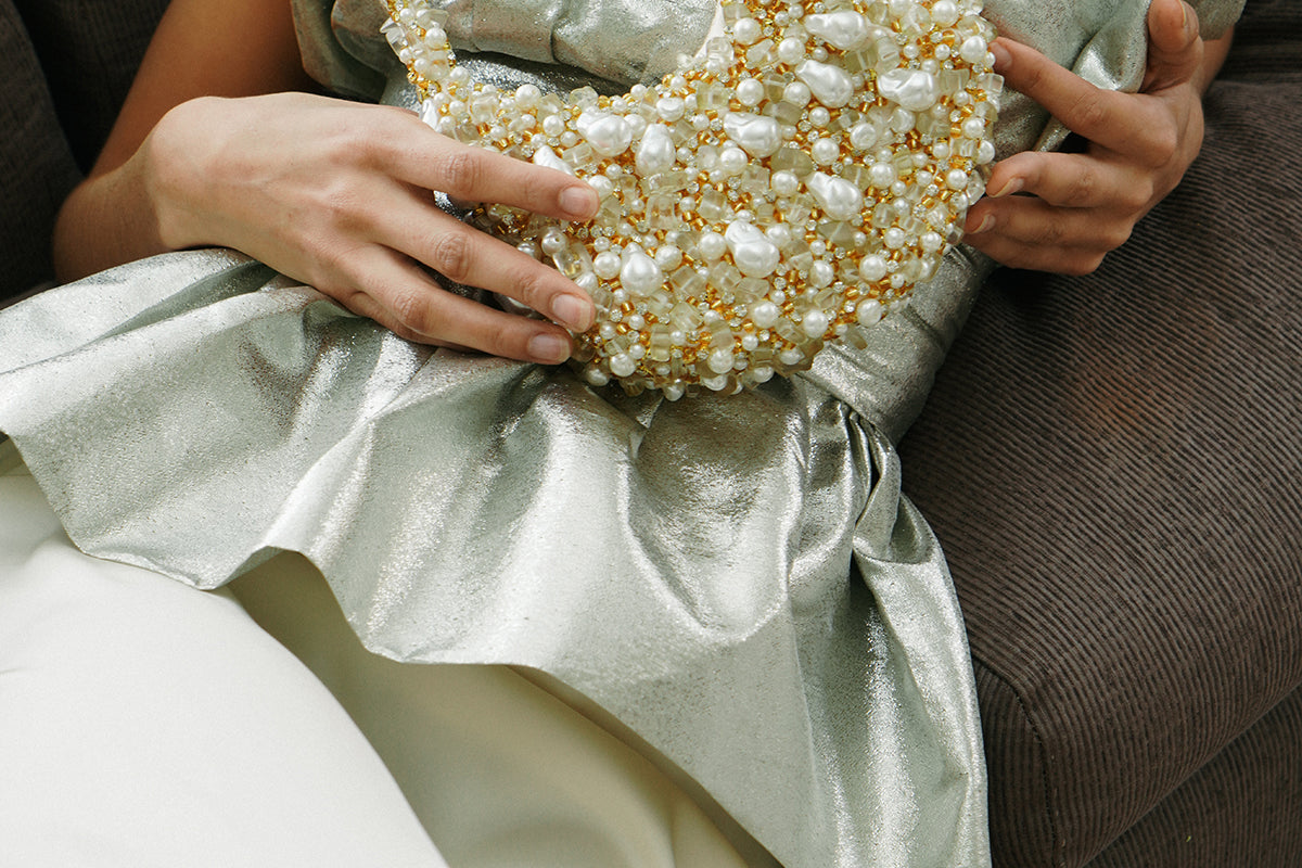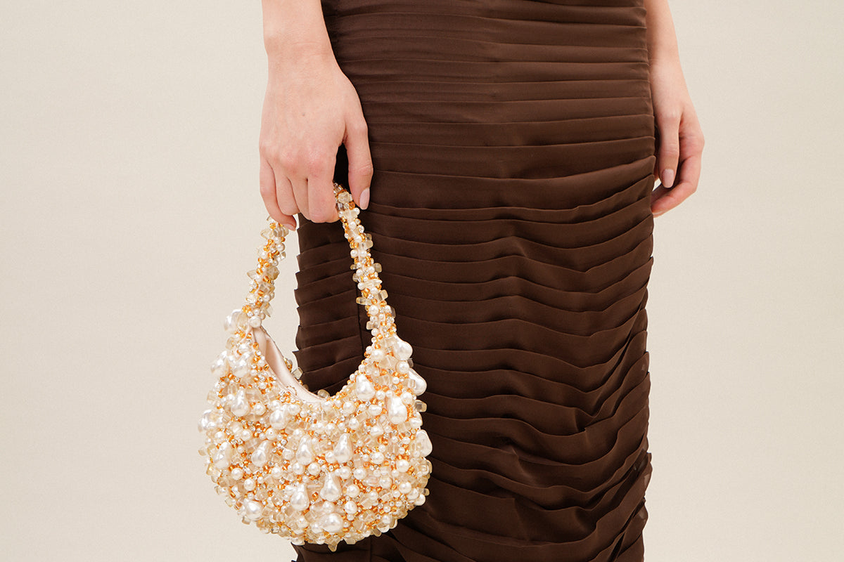 Composition: Acrylic beads, glass beads, crystals, satin lining.