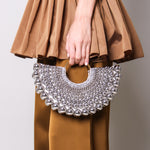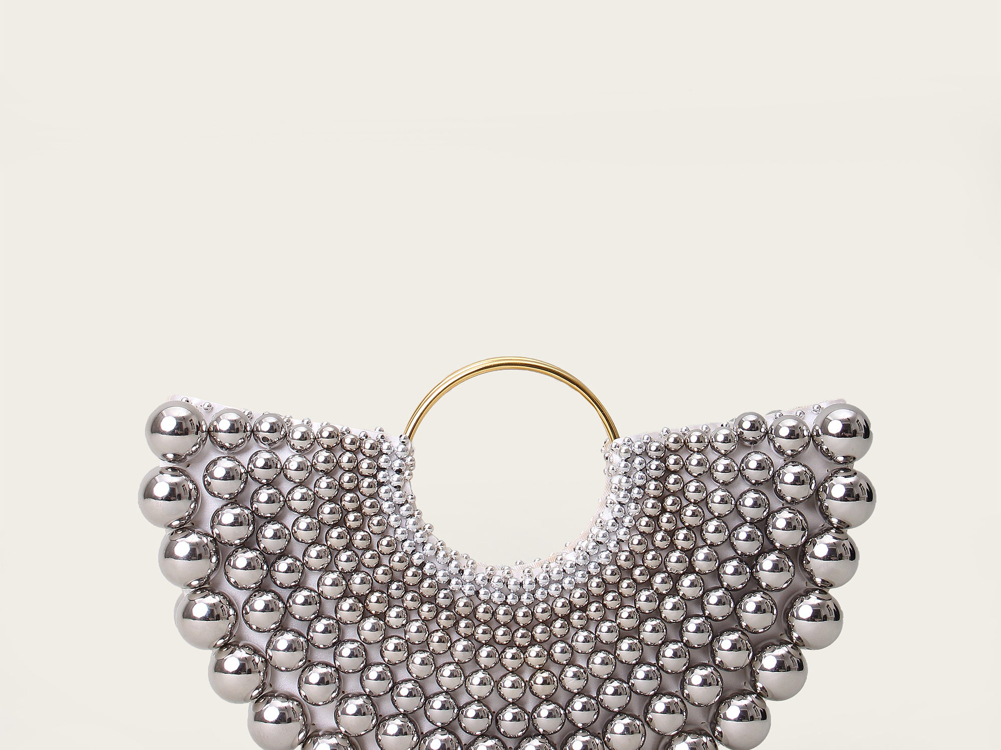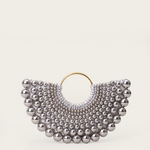 A fan-shaped design handcrafted with cascading glossy acrylic pearls. It features a gold- plated circular handle for a geometric and structured appearance.