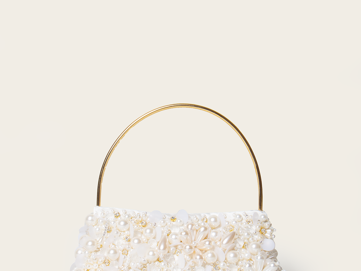 Handcrafted with clusters of shimmery, crystals, sequins, and acrylic beads ; this piece has everything you need for the ultimate statement look. It features a unique rectangular shape with a wide gold handle.