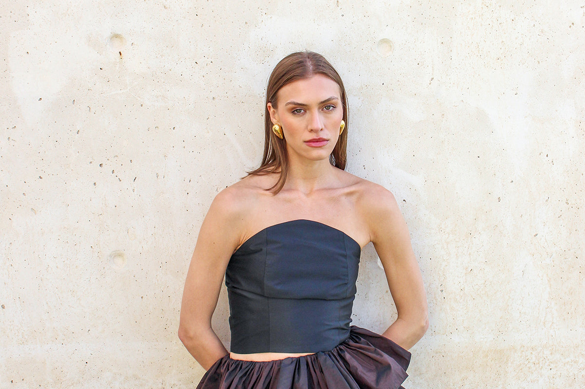 A strapless and cropped bustier top with an arched neckline. It is perfect for dressing up your favorite pants and midi skirts.