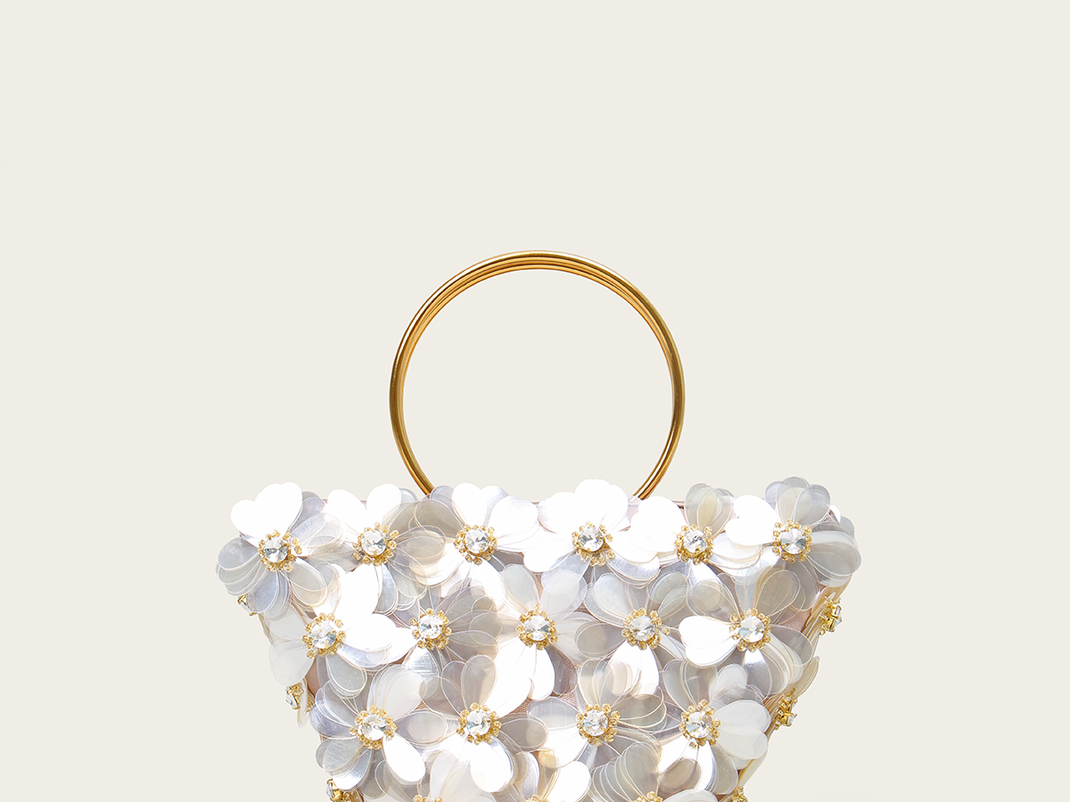 Handcrafted with iridescent sequins blooming around sparkly crystals, this structured piece features a gold handle and brings an interesting three-dimensional texture.