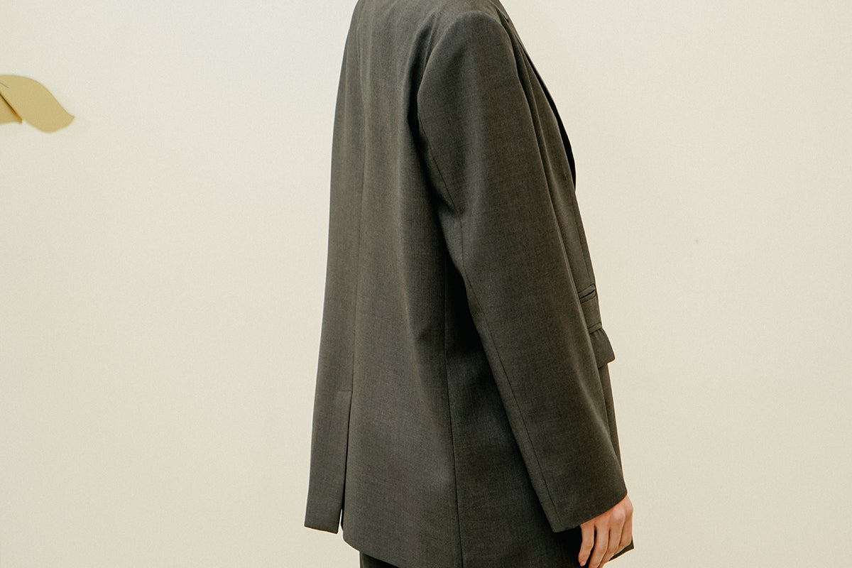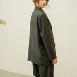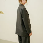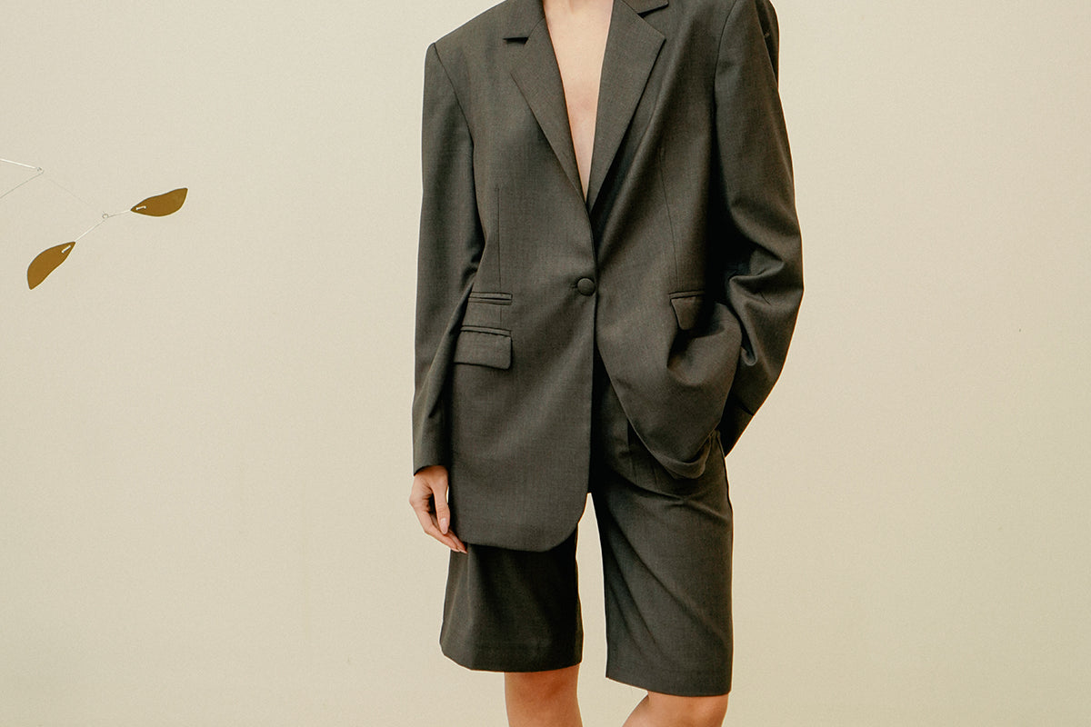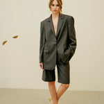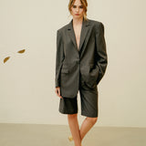 A tailored set featuring oversized bermuda shorts and a structured blazer, crafted with a light mid-seasonal fabric.