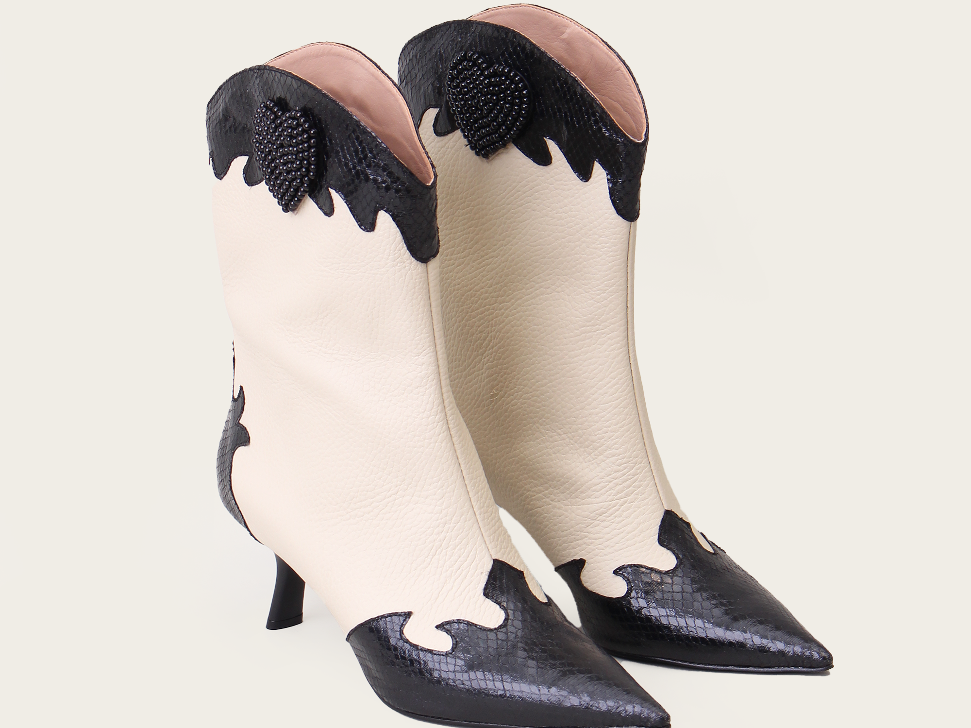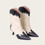 A western-inspired mid-calf boot with a pointy toe. It features a two-toned color scheme with textured and smooth leather detailing. This striking contrast is balanced with a beaded heart, adding a contemporary flare.