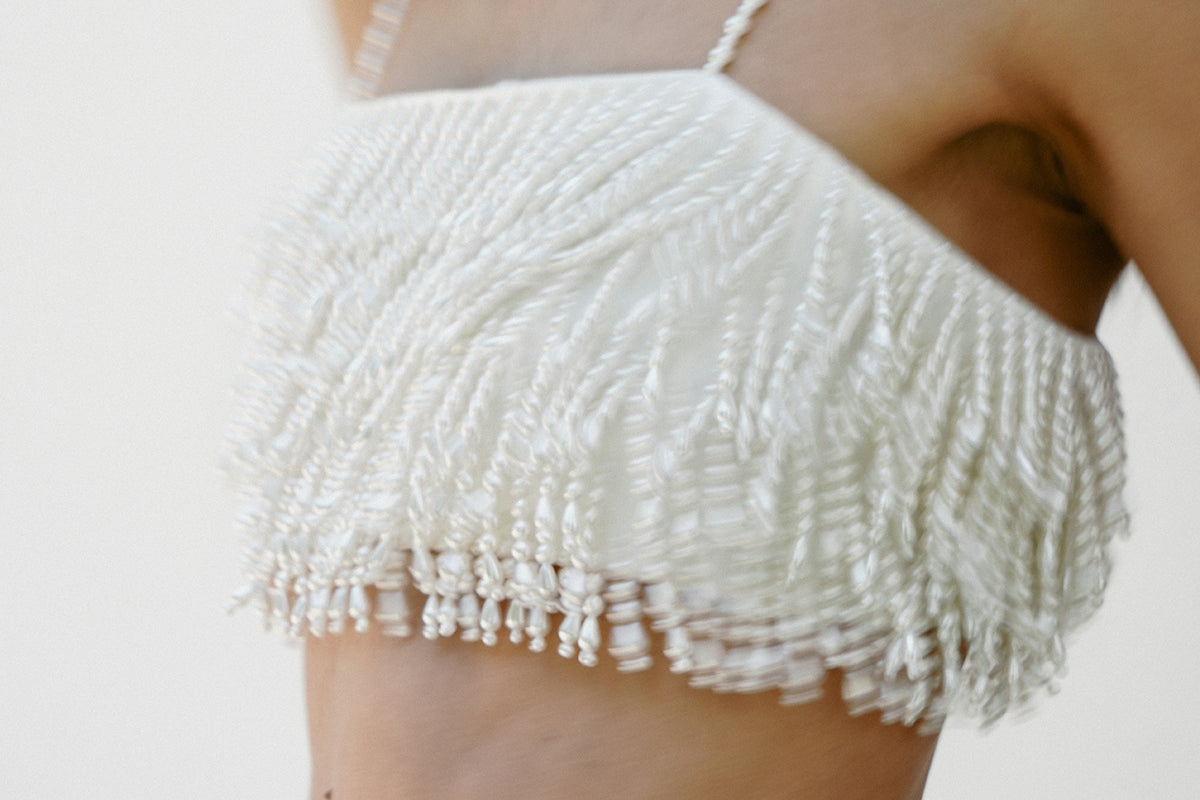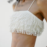 A must-have for your bridal after-party. The 'cascade de caresse' bustier is a cropped piece adorned with cascading beaded fringes that bounce with you as you move.