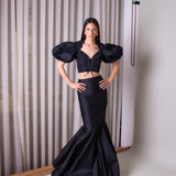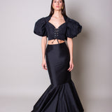 A modern and edgy piece that features a sweetheart neckline with a lace up design in the middle. They are accentuated with crystal details and puff sleeves made with taffeta.