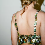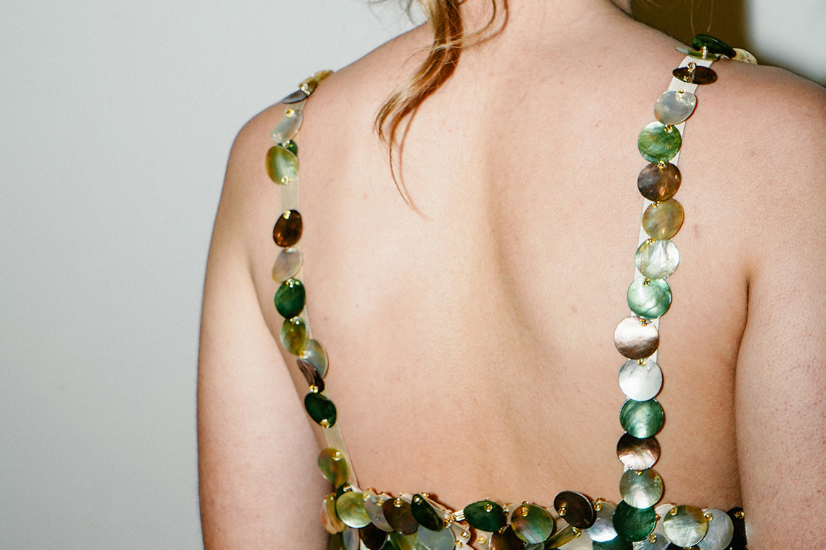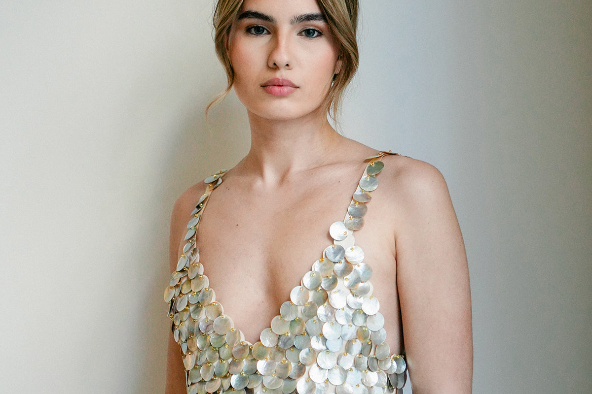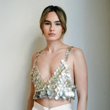 A cropped bustier fully handcrafted with cascading natural shells. A statement piece that can be nicely styled with our ‘Tanya’ flared pants.