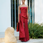 This intricately designed strapless bustier showcases elegant horizontal pleating, adding texture and depth. It is a flattering and cinched silhouette adorned with a statement train on the side. Pair it nicely with our 'Tanya' pants.