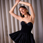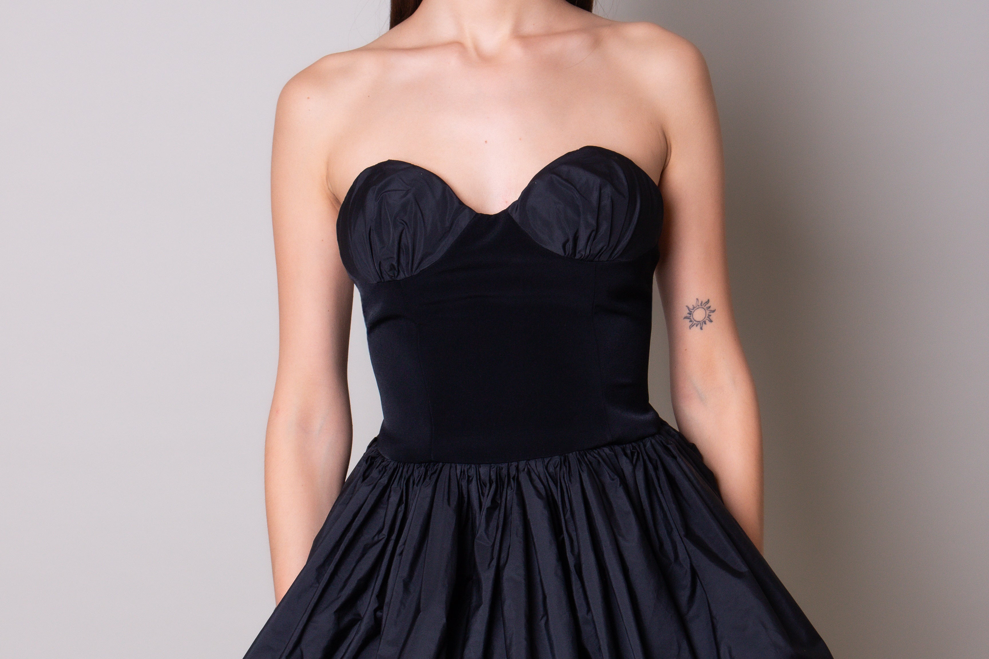 An alluring piece with a sweetheart neckline and folding details at the bust. With a form-fitted cut, it is highlighted by gathered pleats at the waist.