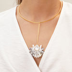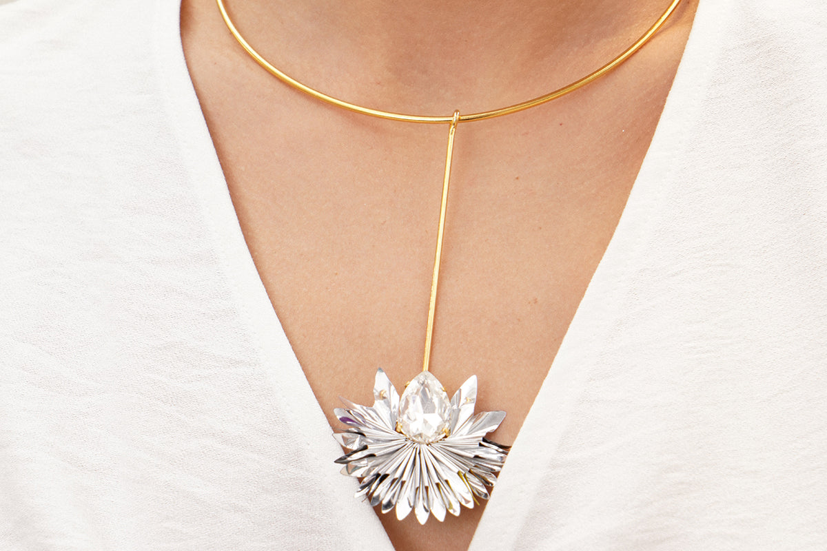 The choker is composed of Swarovski crystals and sustainable handpleated sheets: non-recyclable food packaging individually collected, washed, cut and folded by skillful artisans in Beirut.