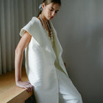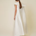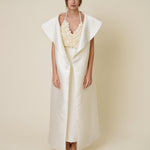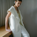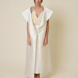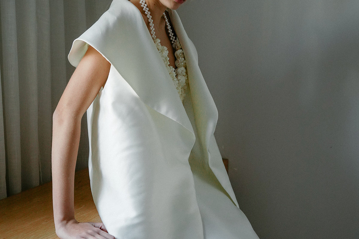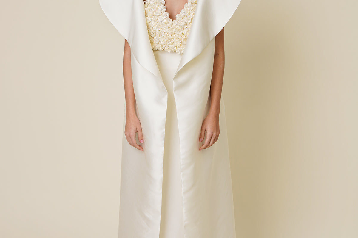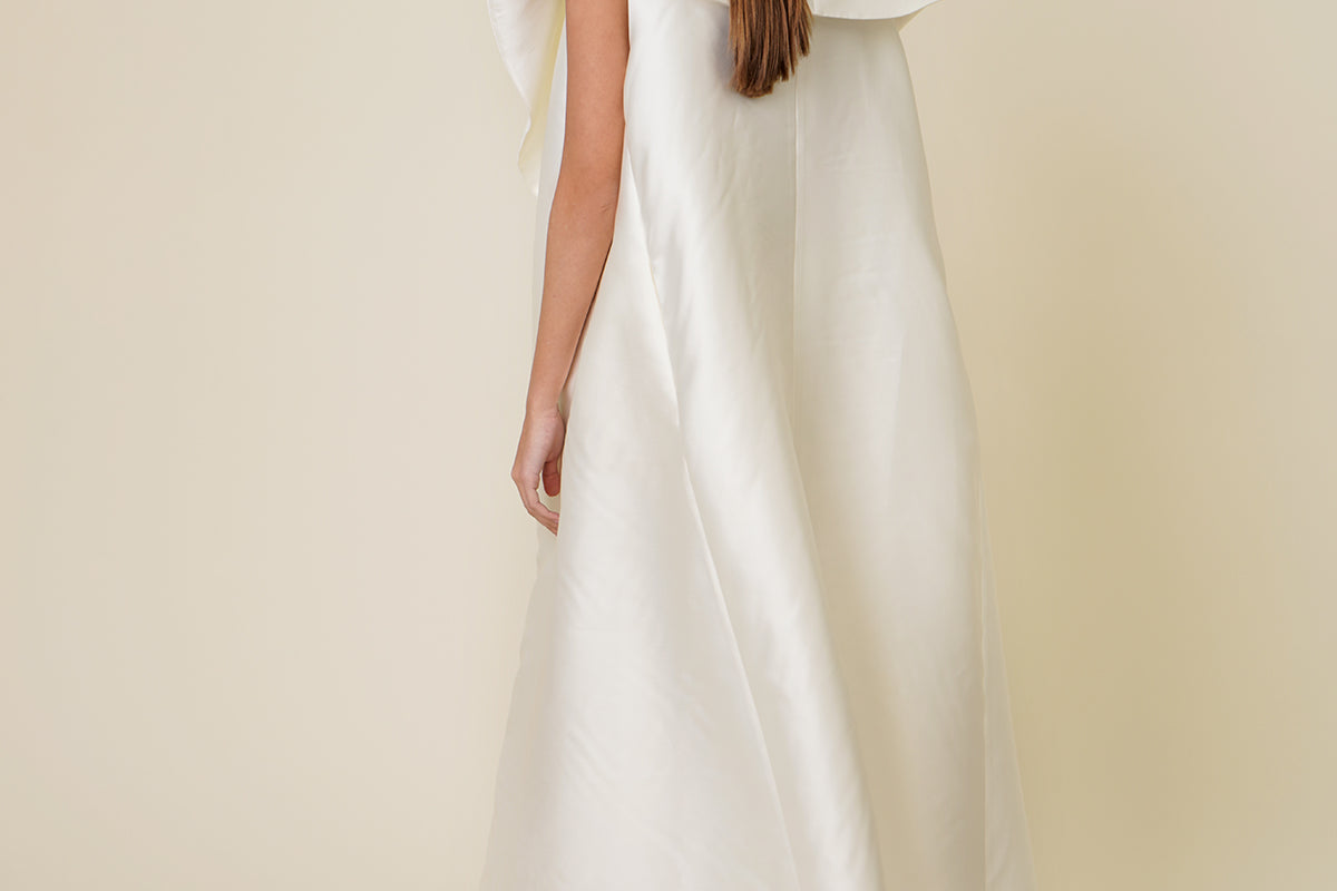 This elegant full-length open cape will add an elevated layer of elegance and glamour to any bridal look. Entirely made with a satiny Mikado fabric, you can easily wear it over your gown or as an alternative to your veil.