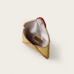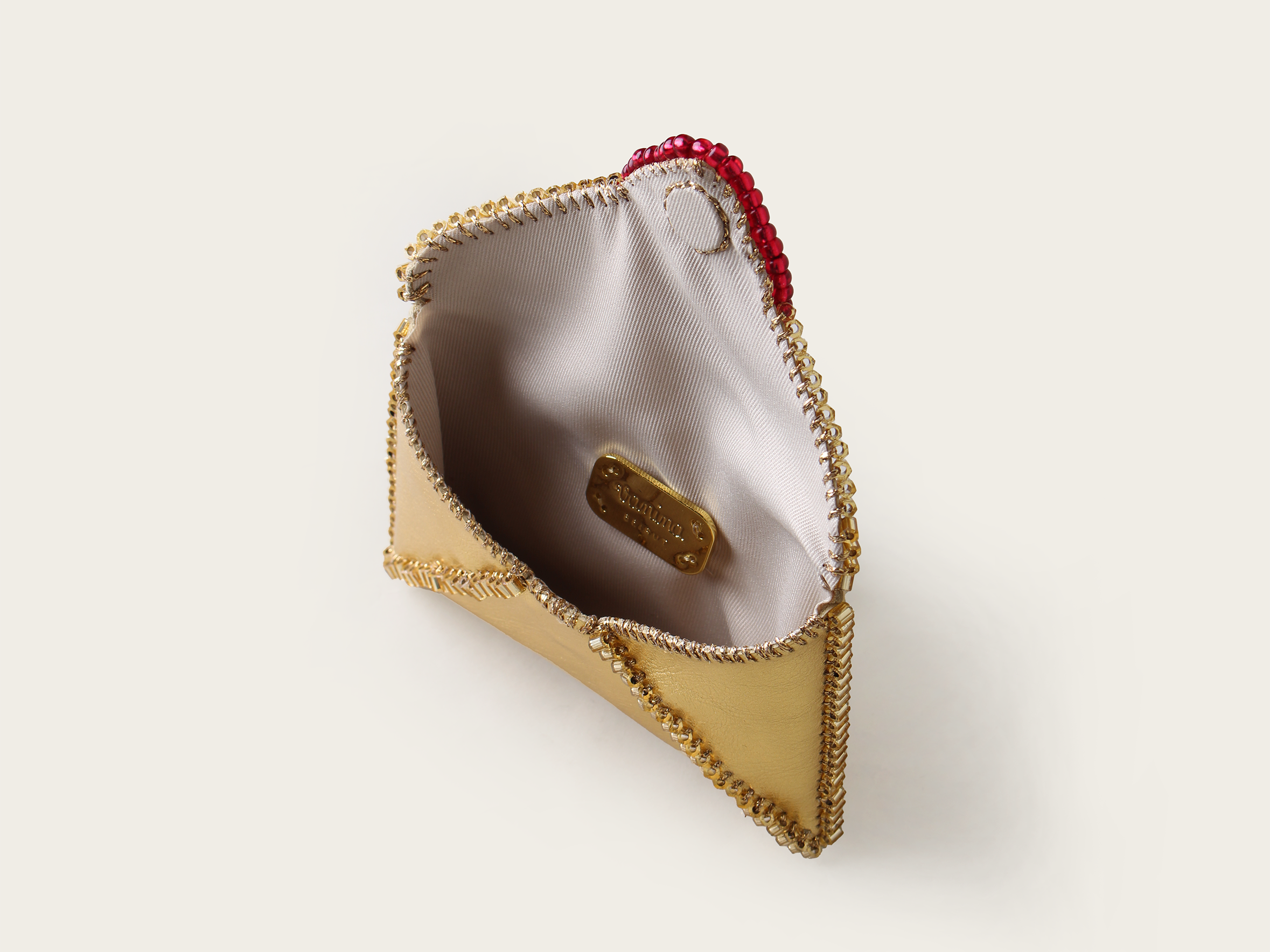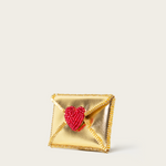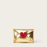 A piece that will carry your cards with love. A envelope-shaped cardholder with beaded edges sealed with a magnetic closure topped with a bejeweled heart.