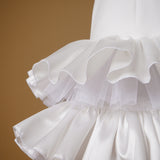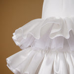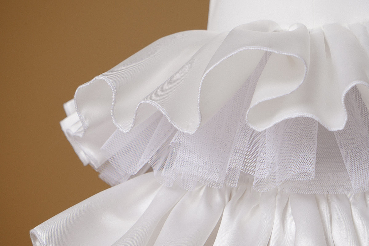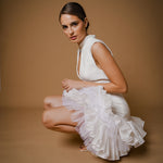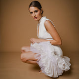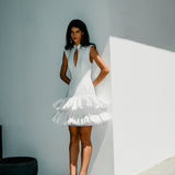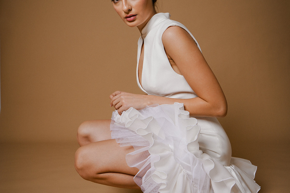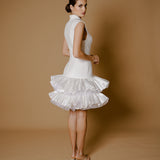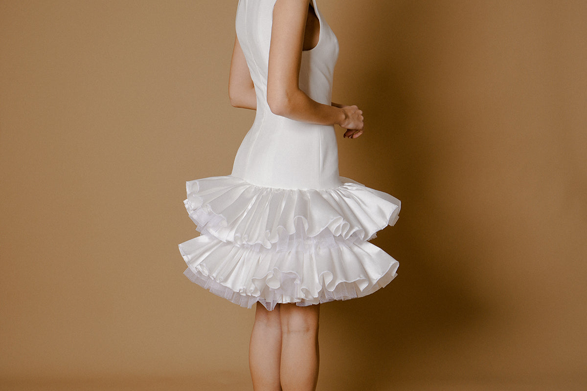 A modern and chic silhouette for a cocktail event. This short dress features a mandarin collar with a keyhole detail and is accentuated by voluminous ruffled layers.
