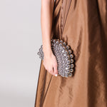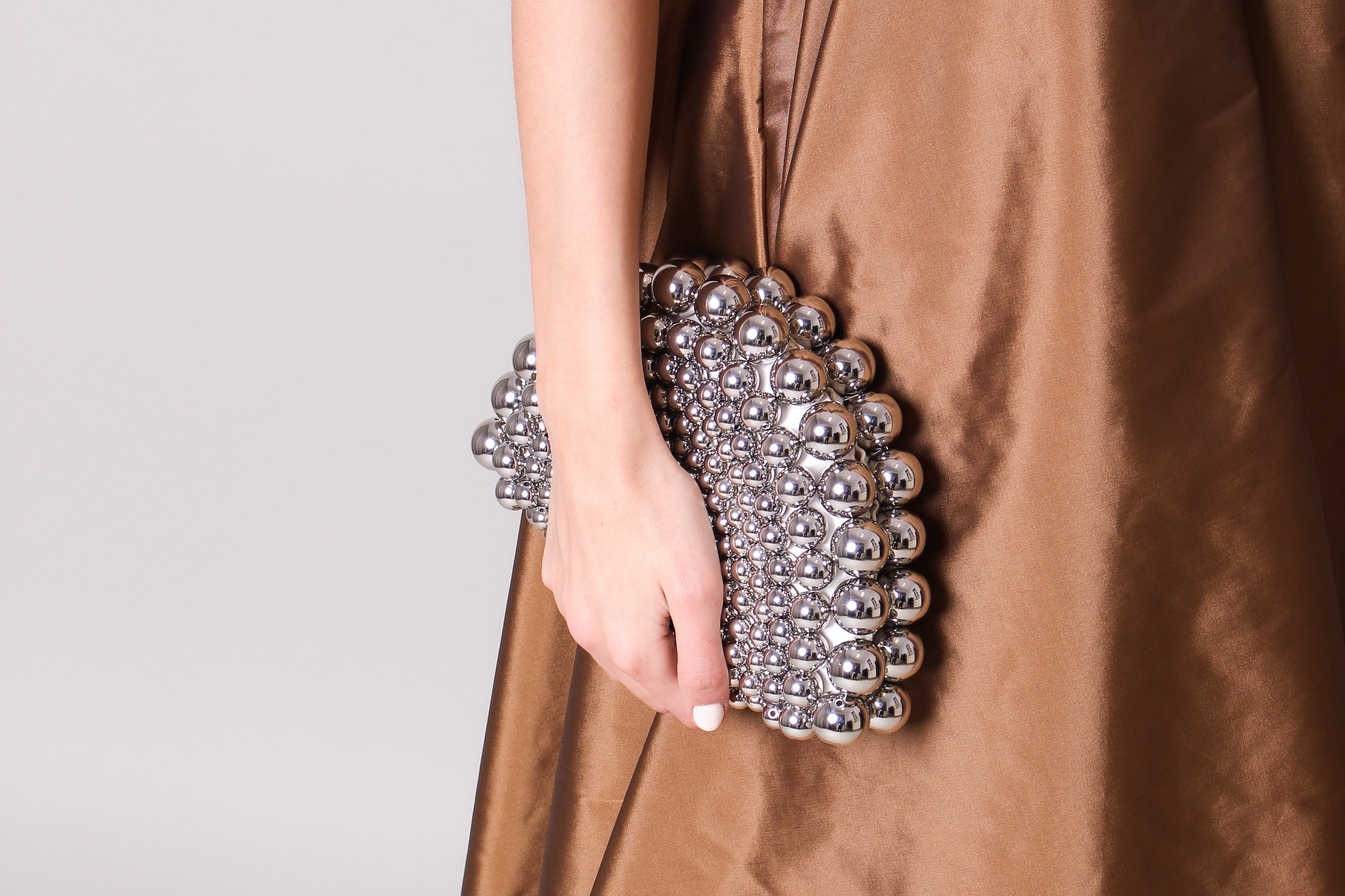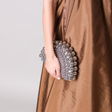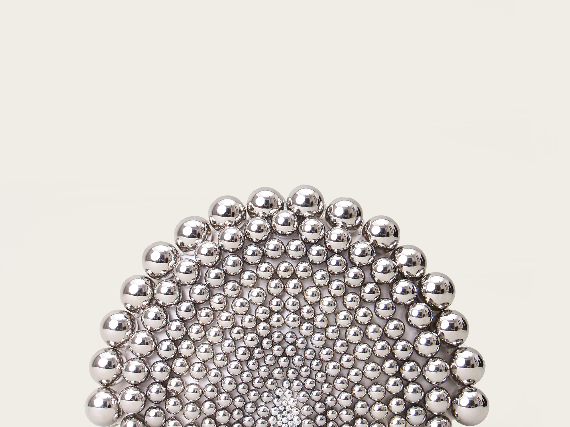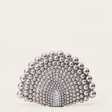 An arch-shaped clutch, meticulously handcrafted and entirely adorned with pearls of varying sizes. With a sleek magnetic closure and a glossy finish, it combines sculptural beauty with timeless sophistication.