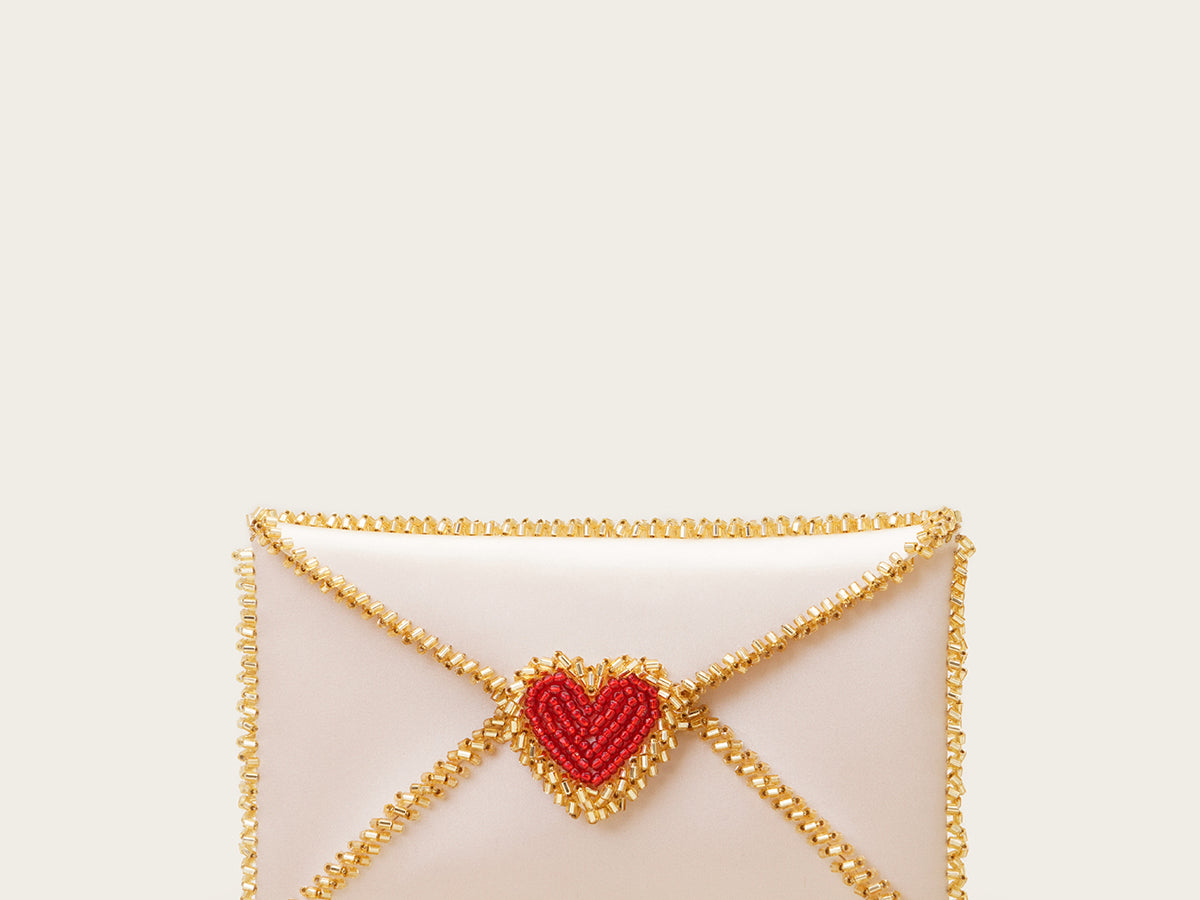 A love letter to carry you throughout the night. An envelope-shaped clutch with beaded edges, sealed with a bejeweled red heart. .
