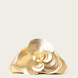 A spacious clutch with gathered fabric and a magnetic closure and adorned with an oversized handcrafted flower. Evoking a blooming rose, it brings the ultimate touch of romance and sophistication.