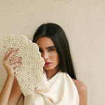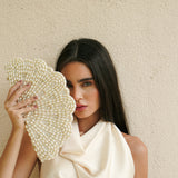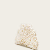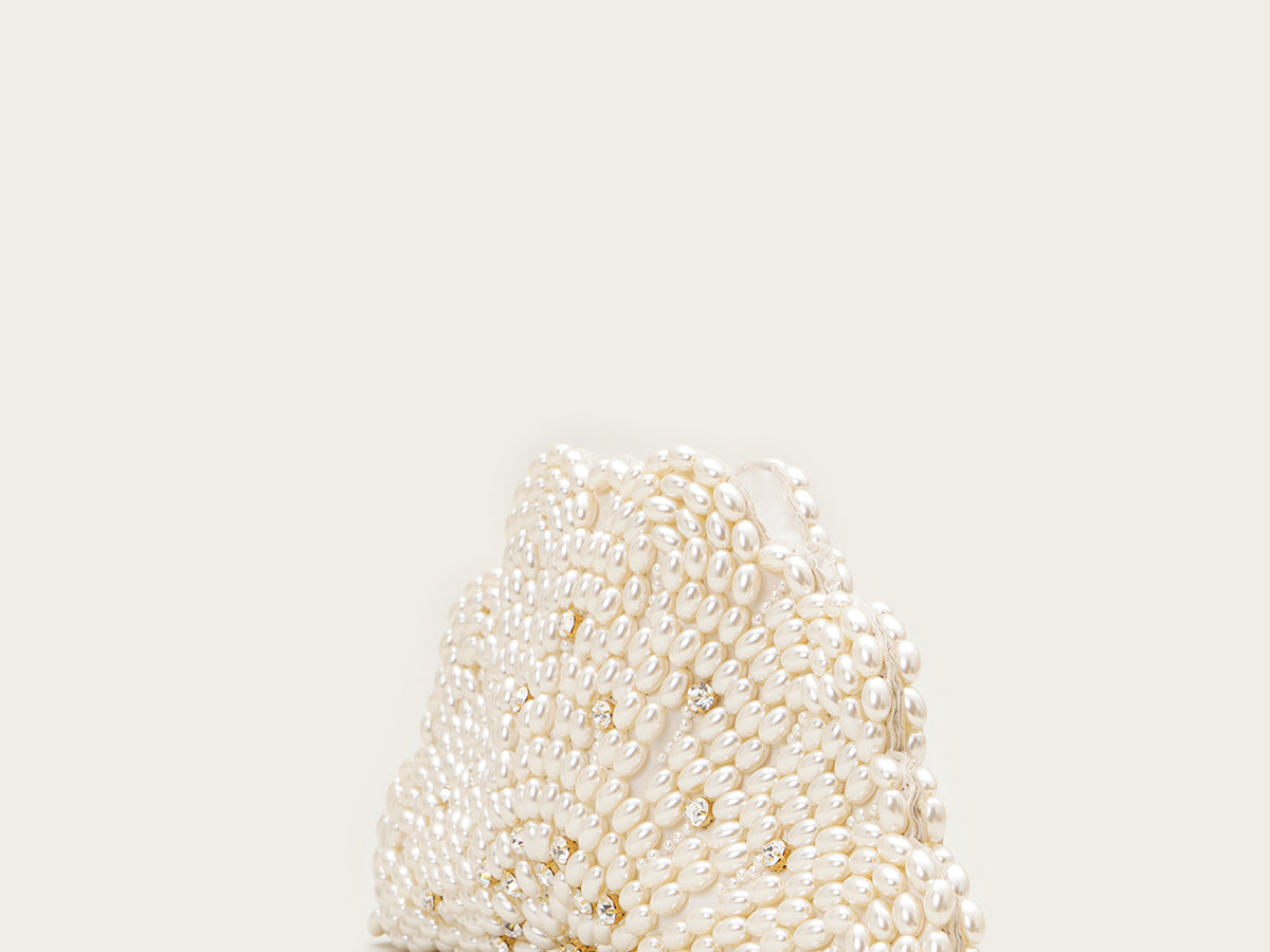 A unique seashell-shaped clutch with a mix of pearls and crystals, sealed with a magnetic closure. It's perfect for adding a natural elegance to any special look.