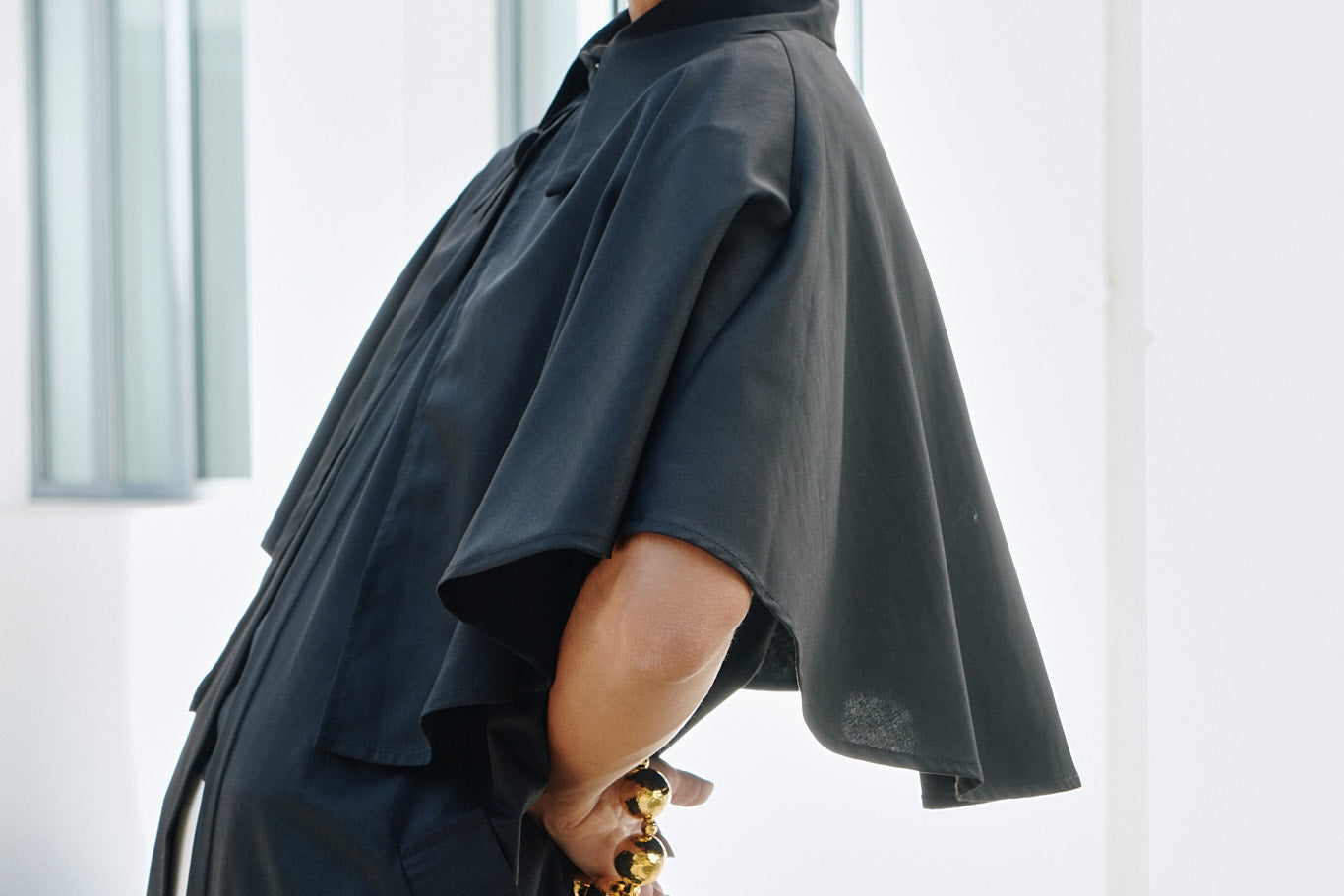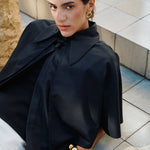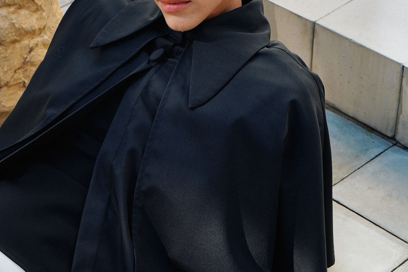 A vintage-inspired full-length coat with a cape that drapes over the shoulders. It features a traditional structured collar with a top button.