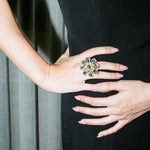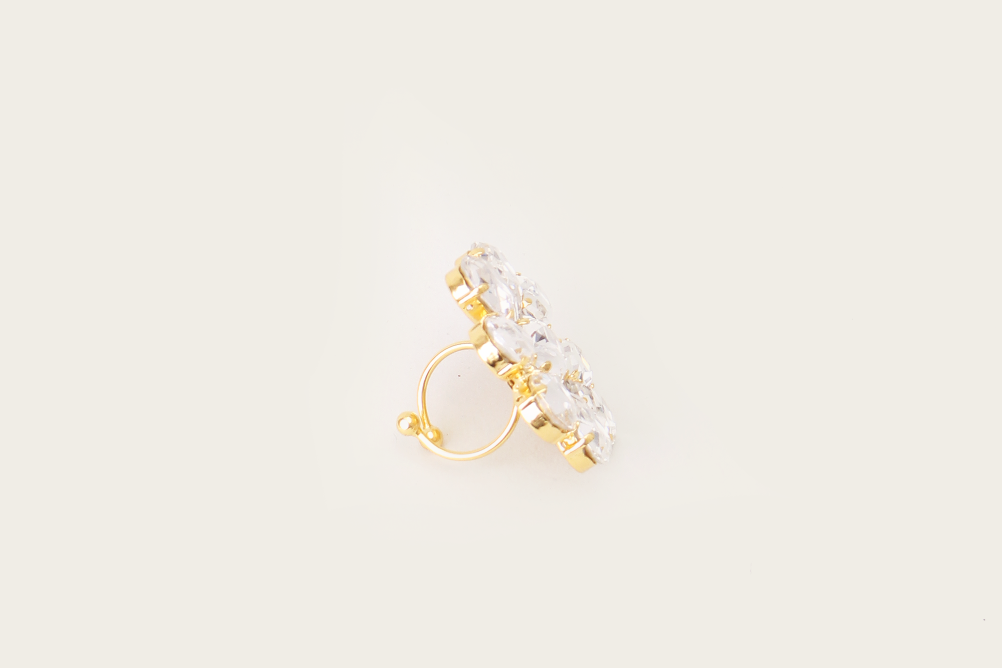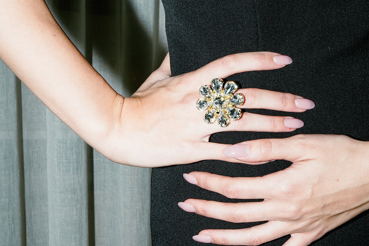 A vintage-inspired collection that reflects radiance and sophistication. The 'Diademe' adjustable ring is crafted with dazzling geometric crystals, creating various statement shapes.