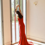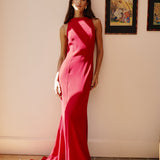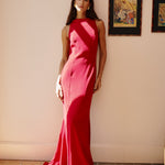 An elegant and regal piece with a high neck and a fitted bodice. It tansitions into a long train that elegantly moves with you.