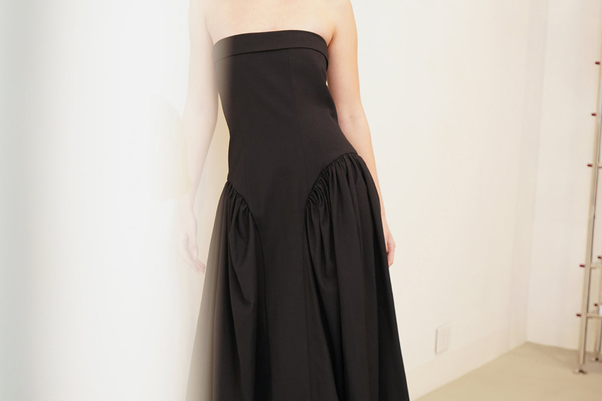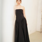 A strapless silhouette with a full midi skirt that reflects sophistication. It includes a drop waist and a panel along the bodice for a fitted cut.