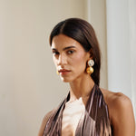 A refined piece that exudes elegance and grace. Featuring halter-style straps made in a lamé voile material, this dress is accentuated by a fitted bodice and a pleated bell-shaped skirt.