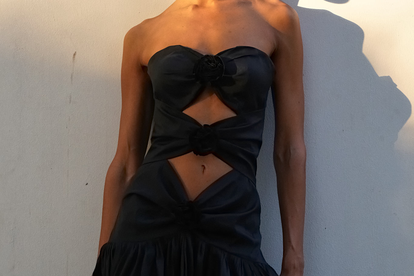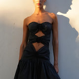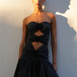A Vanina best-seller for all formal occasions. Our 'Belle de Nuit’ strapless dress features three cut-outs for a sensual allure. It is made from a refined silk taffeta and is embellished with handcrafted flowers made by our best artisans.