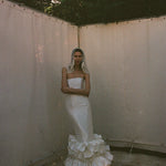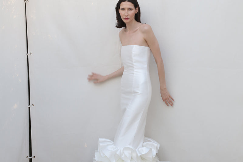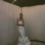 A strapless and structured straight bodice, the 'bianca' dress is completed with gathered ruffles made with layers of tulle in between.