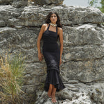 A soft silhouette with a pleated design reminiscent of sand dunes. The 'Desert du Sahara' dress is a halter-neck style dominated by gathered pleats with a flirty ruffled hem.