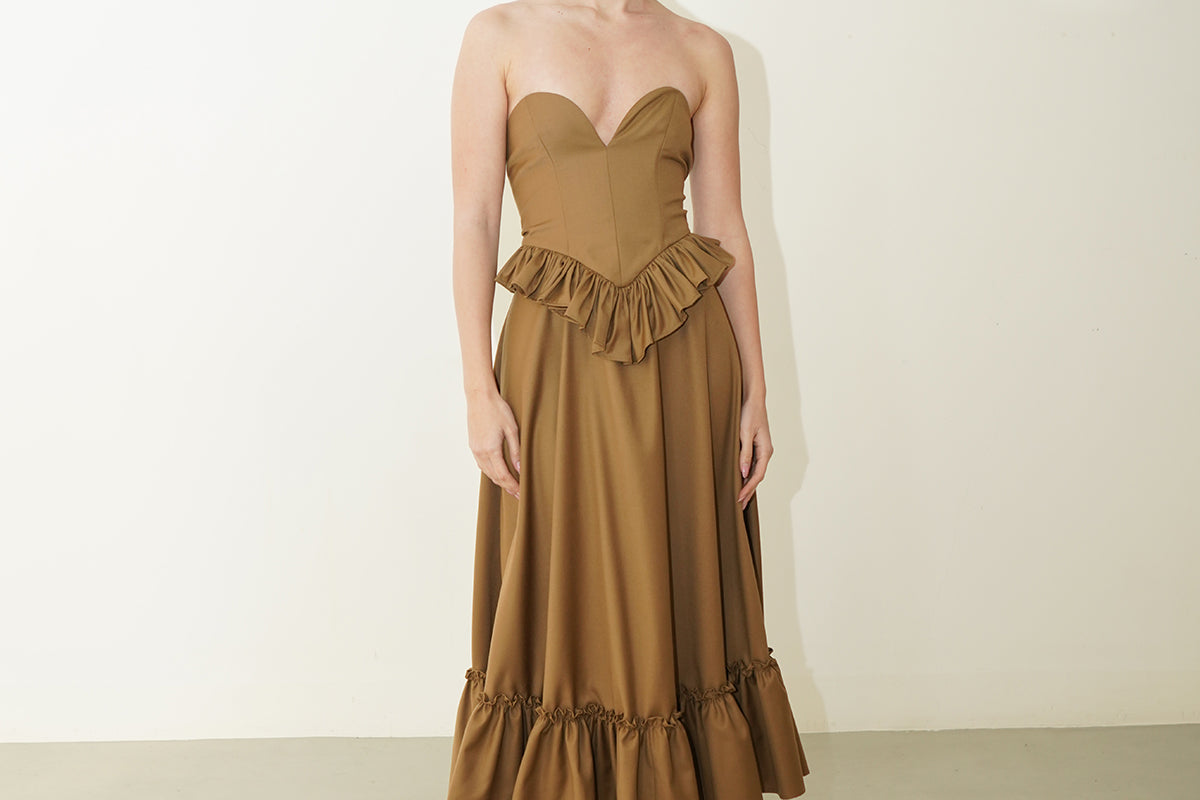 A perfect piece that will take you from day-to-night events. The dress features a heart-shapped neckline with multidimensional ruffles on the bodice and the hem.