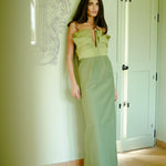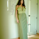 The 'Gardenia' dress is a strapless piece featuring a plunging neckline and ruffle detailing applied to the bust, completed with a straight skirt. It is cut from silk taffeta and cotton canvas, creating a soft contrast.