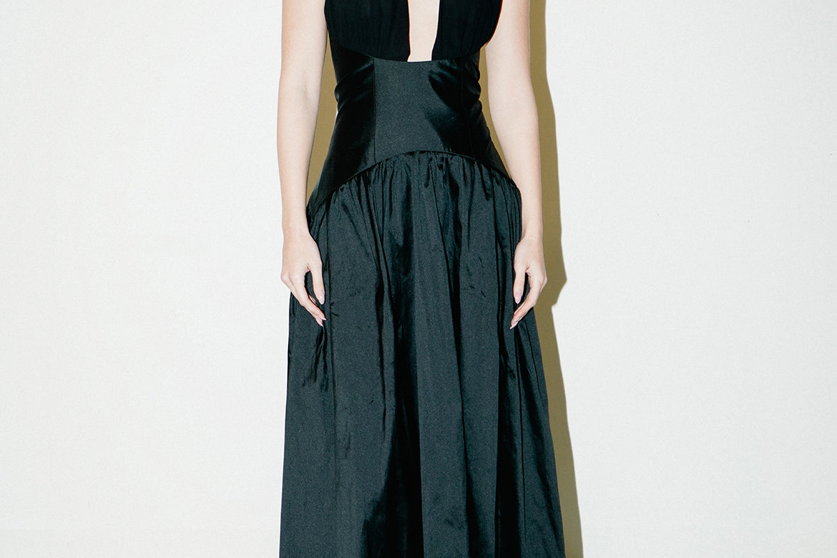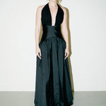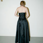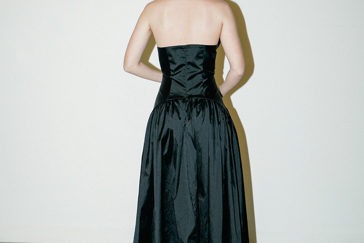 A refined piece that exudes elegance. Featuring halterstyle straps and with horiztonal pleating at the waist, it is emphasized by a bell-shaped skirt.