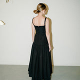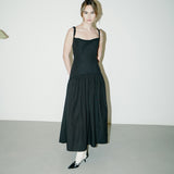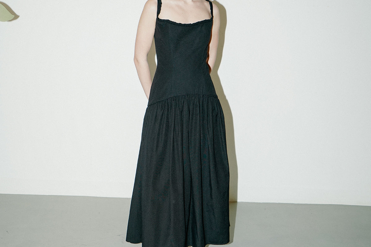 A piece blending avant-guarde and elegance, it features a fitted bodice, highlighting the waist, with delicateruffled straps. The skirt transitions into a voluminous shape with gathered fabric at the hem.