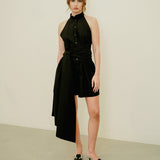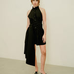 This dress features a structured, sleeveless cut with a high, mandarin collar for a polished, refined look. It features an oversized wrap-around sash that ties at the waist.