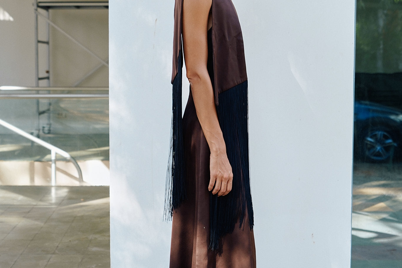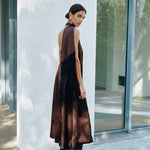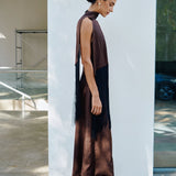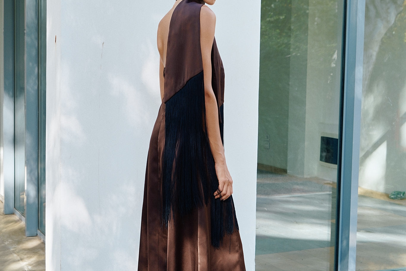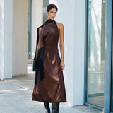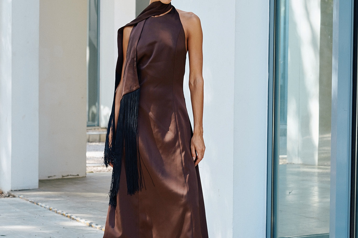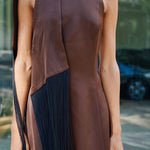A high neck midi dress with a fitted bodice that transitions into an A-line skirt. Crafted in a rich satin material, it is highlighted with a flowing fringed shawl on the neck.