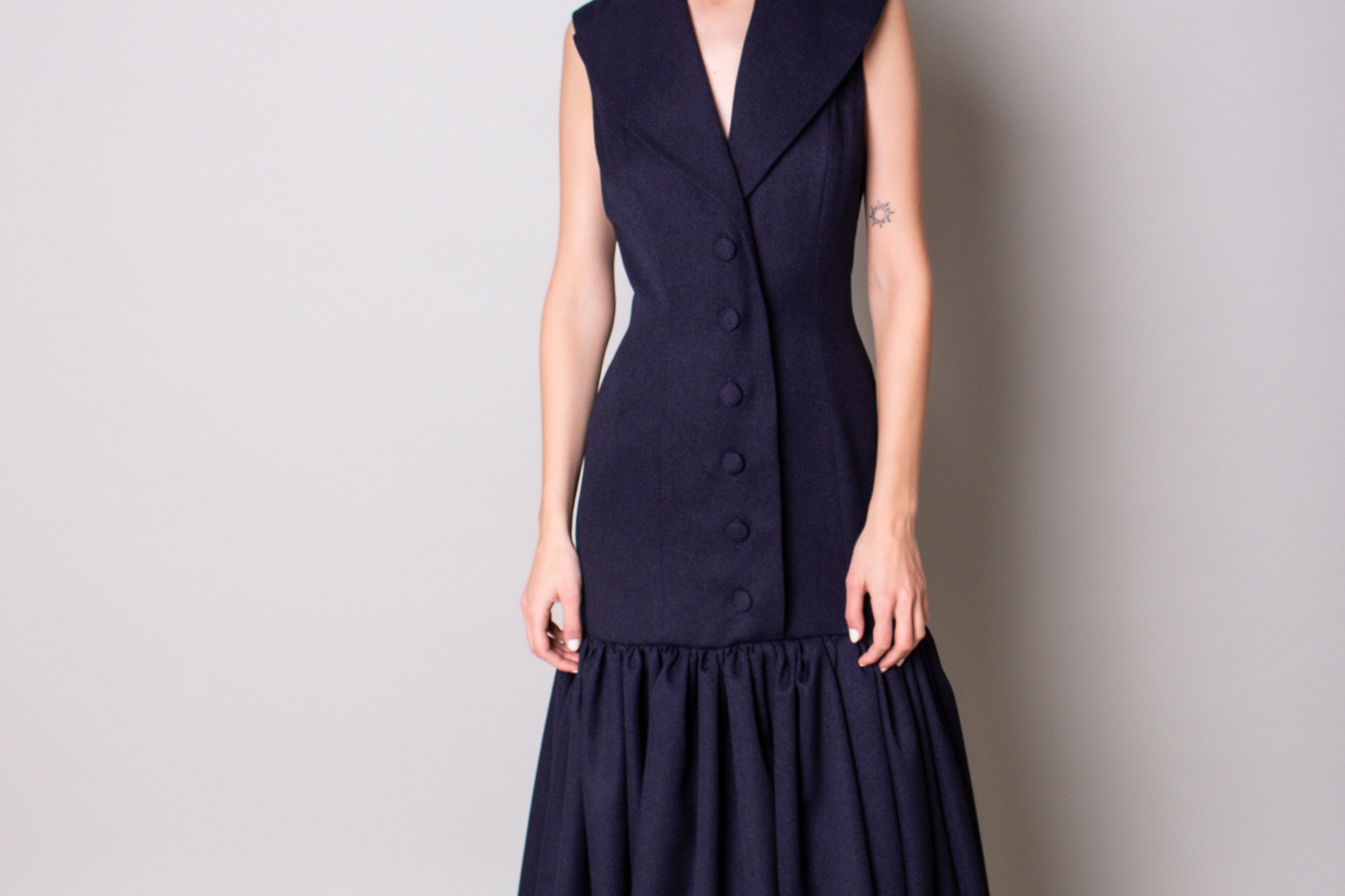 A retro piece featuring a large sailor collar with a V neckline and a fitted bodice. It is completed with mermaid-inspired pleats at the bottom and oversized buttons.