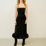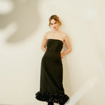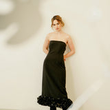 A fun and coquette piece that speaks for itself. Made with a shimmery black organza, the 'sable chaud' dress is a midi strapless silhouette with gathered ruffles at the hem.