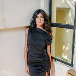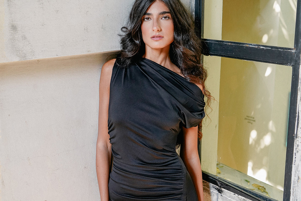 Crafted from a stretchy light lycra fabric, the 'Salma' dress offers a sleek, long, straight silhouette. Its standout feature is the asymmetric neckline, beautifully complemented by a gathered draping effect around the bodice.