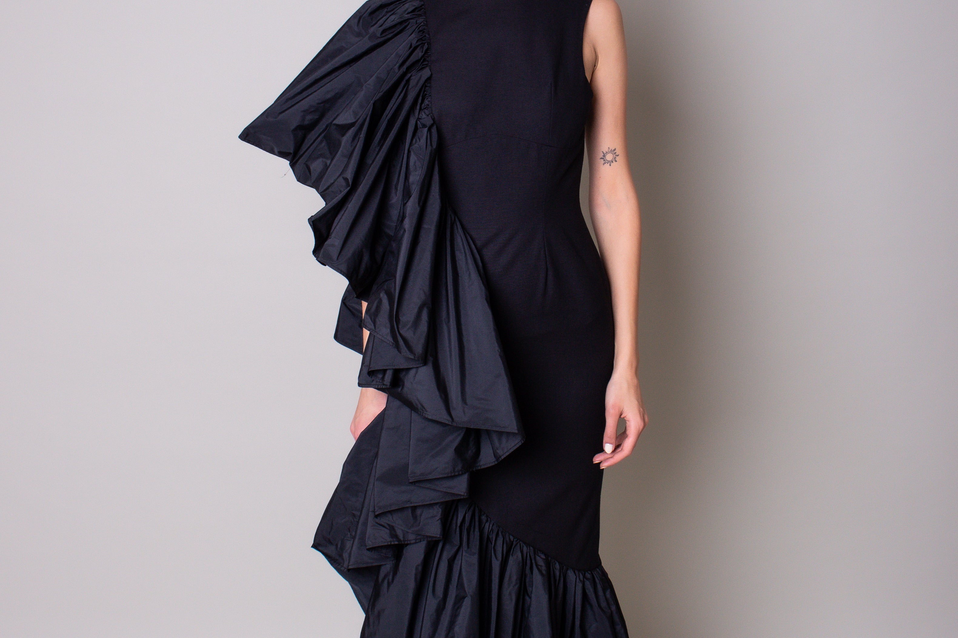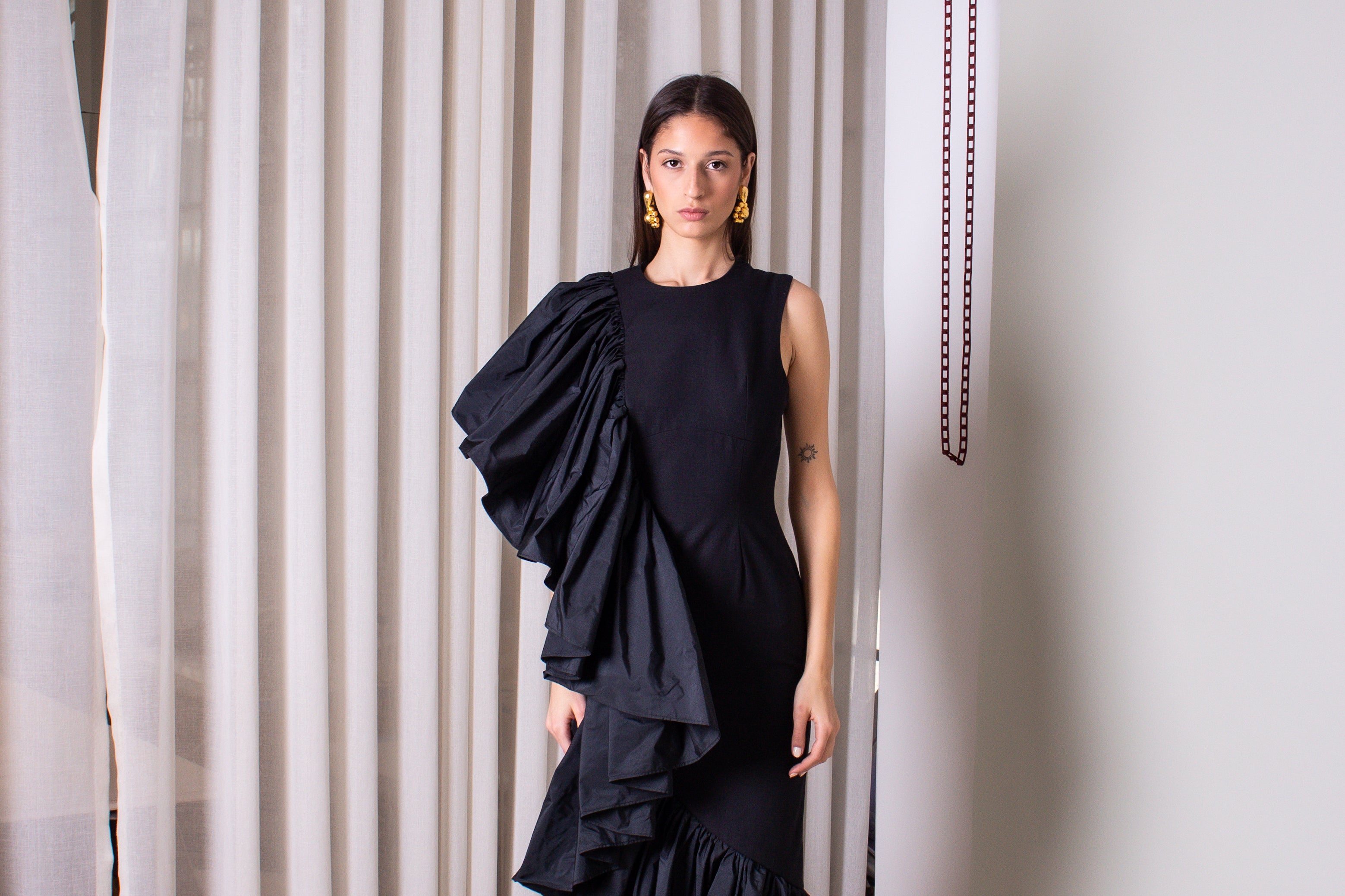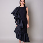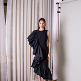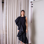 A statement and glamorous piece made with a refined taffeta material. The 'soleil des tropiques' midi dress features a structured bodice and voluminous ruffles on one side from the sleeve down to the hemline.