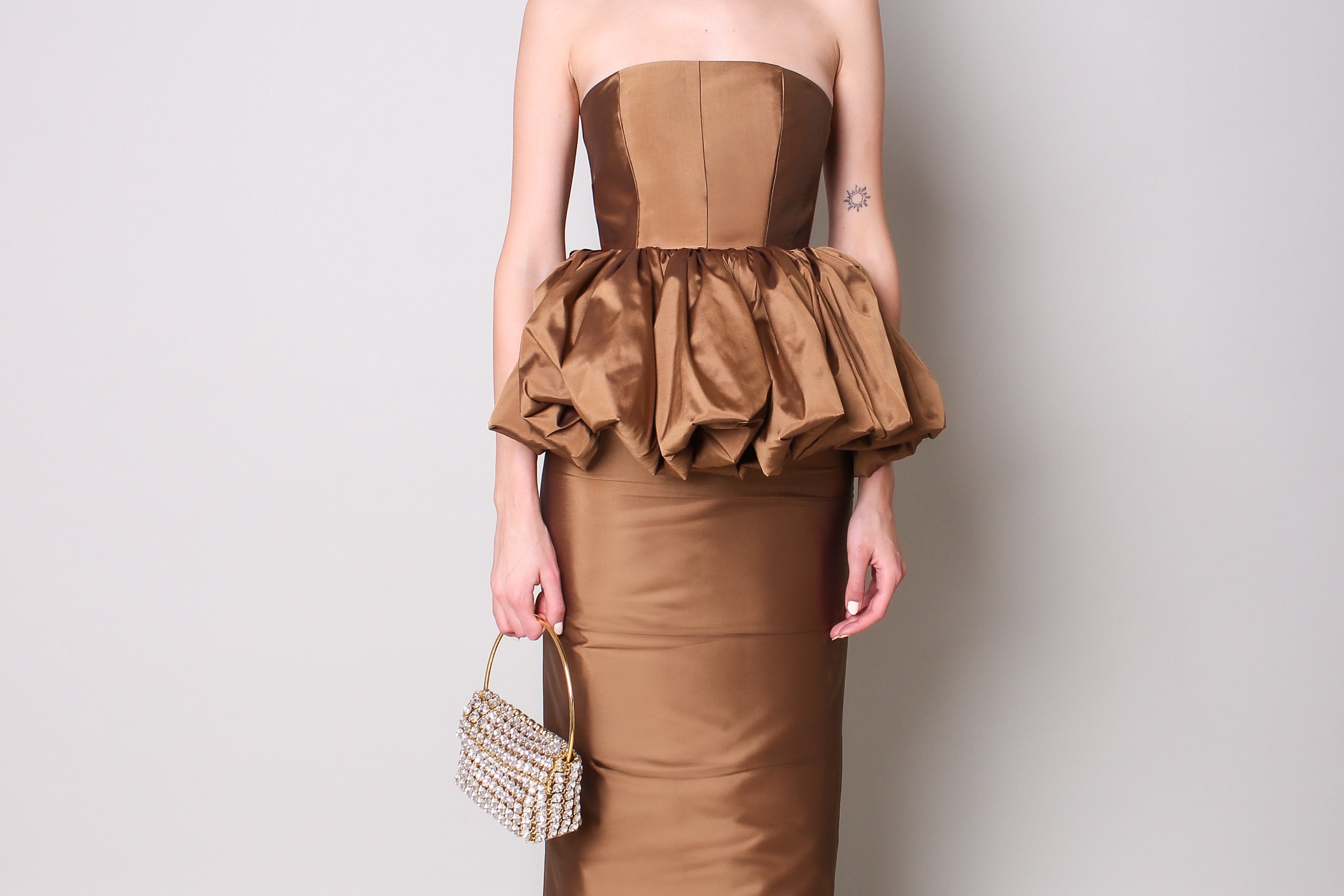 Inspired by the blooming tulip flower, this satement piece is a strapless floor-length dress featuring bell-shaped ruffles on the bodice.