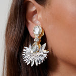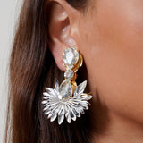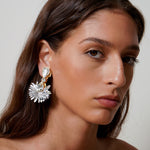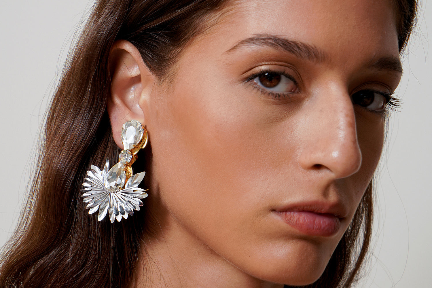 The earrings are composed of Swarovski crystals and sustainable handpleated sheets: non-recyclable food packaging individually collected, washed, cut and folded by skillful artisans in Beirut.