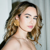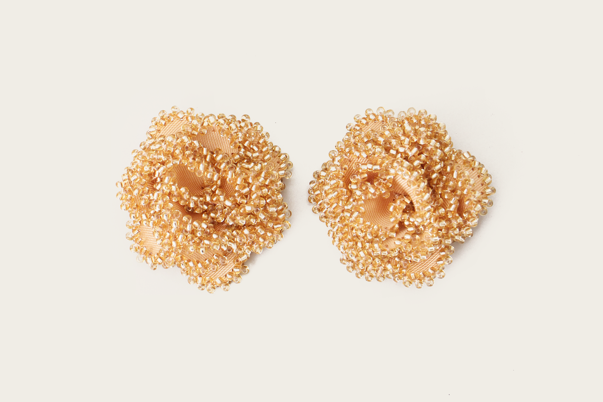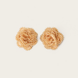 Inspired by the glamour of blooming petals, these clip-on earrings are handcrafted with laser-cut gathered petals. They are intricately embellished with acrylic beads, offering a touch of whimsy and romance to any outfit.
