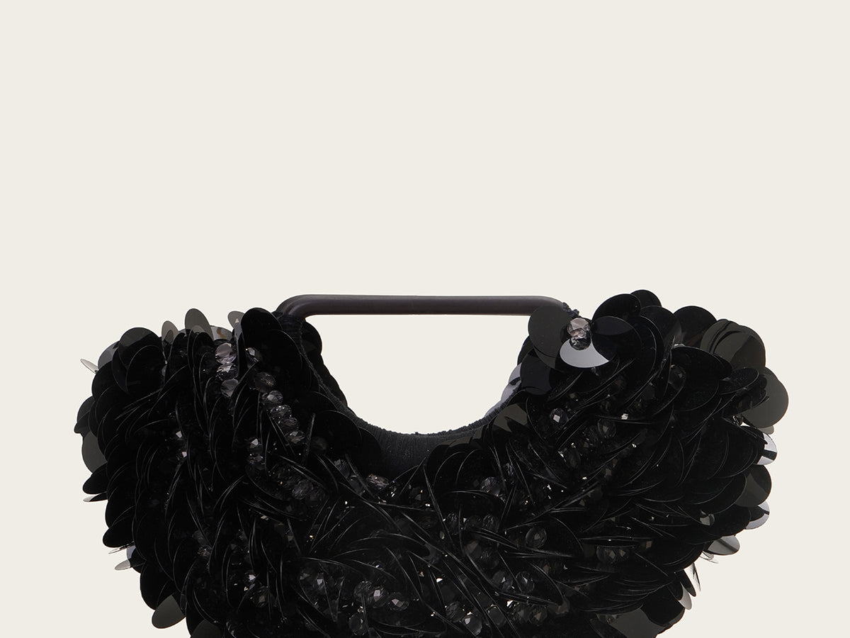 A crescent shaped bag with many dimensions. The 'Eclat De Lune' clutch is hand-crocheted and layered with matte sequins and glass beads. The subtle flat handle makes it easier to carry through the night.