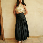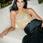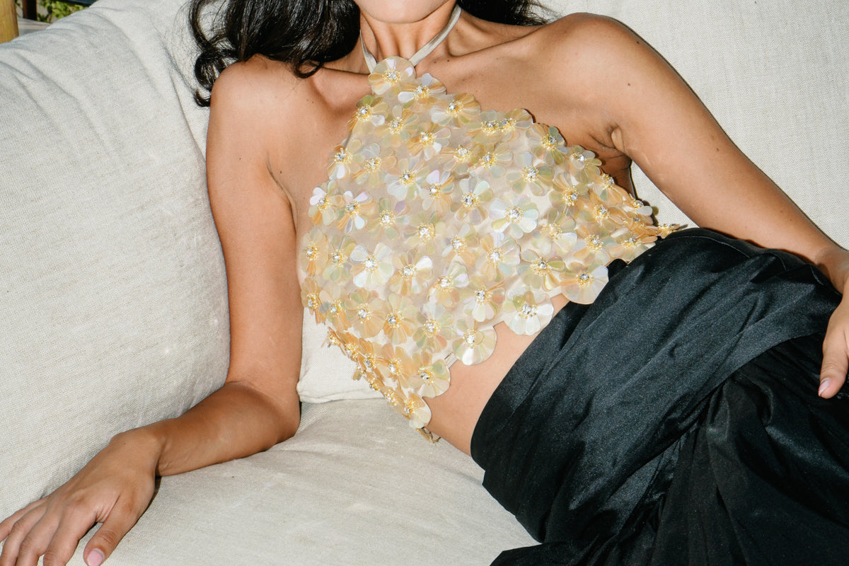 A dazzling bustier with a high neck and scalloped edges, fully adorned with handcrafted flowers, made with crystals and iridescent sequins. Pair it nicely with the ‘Gondole’ skirt.